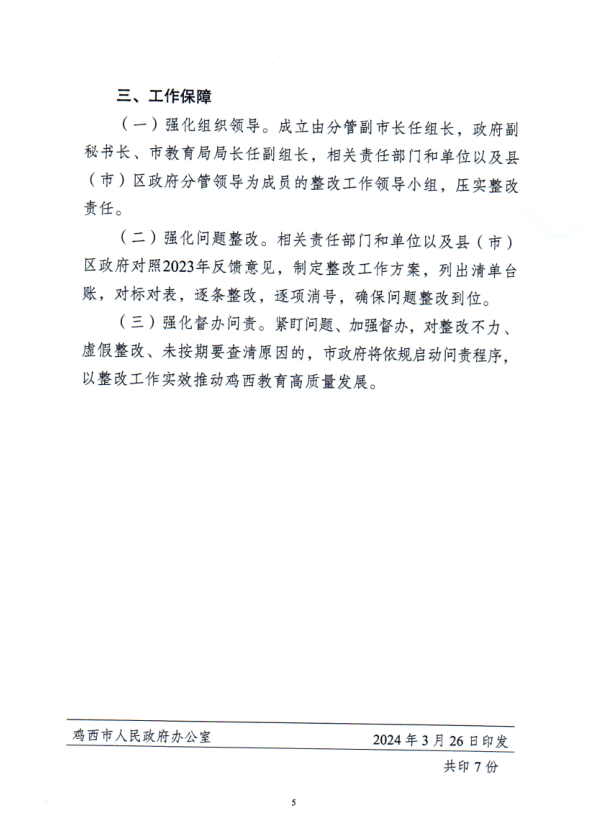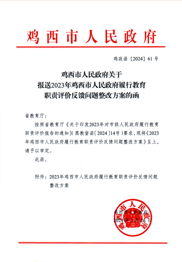鸡西市人民政府关于报送2023年鸡西市人民政府履行教育职责评价反馈问题整改方案的函