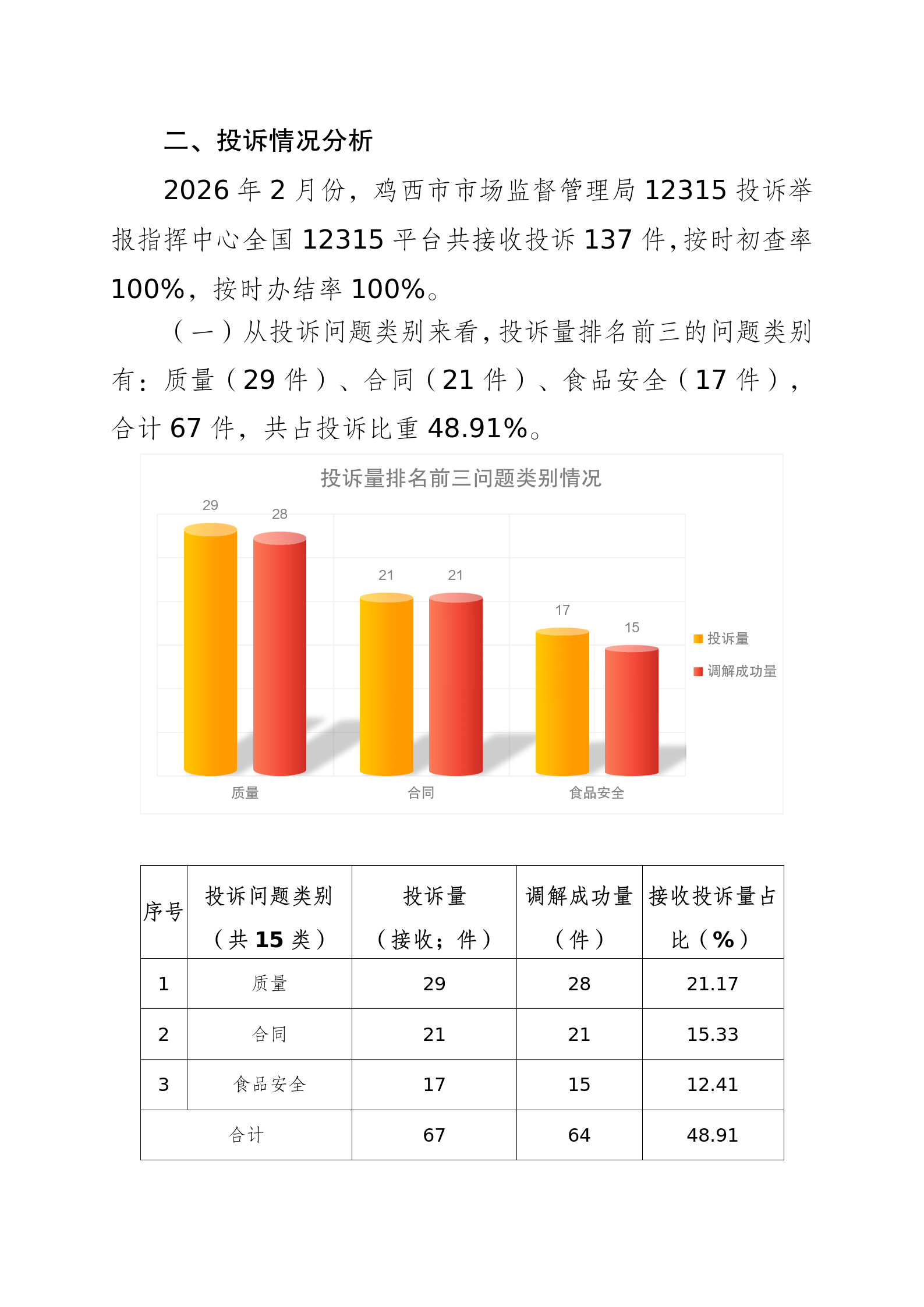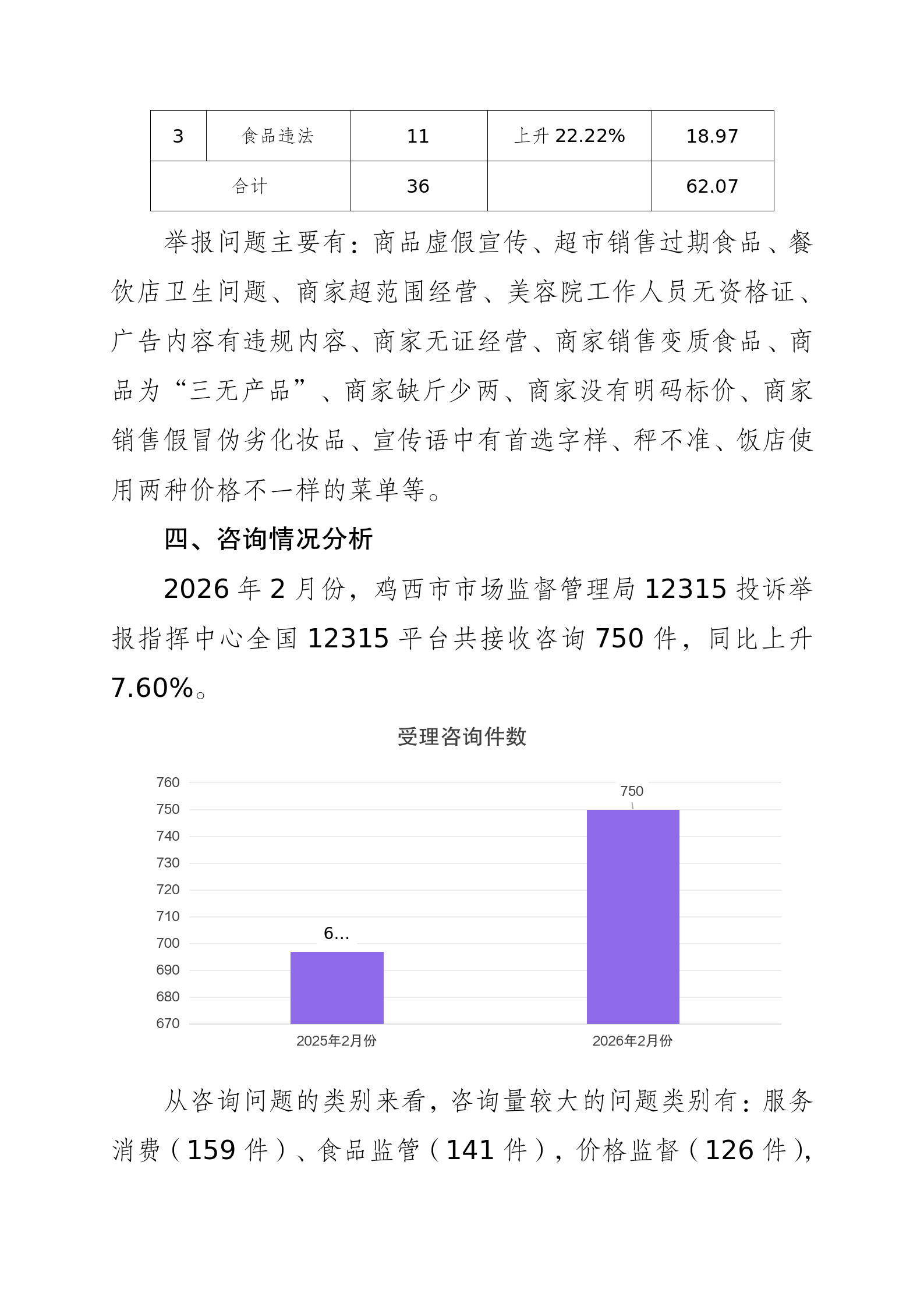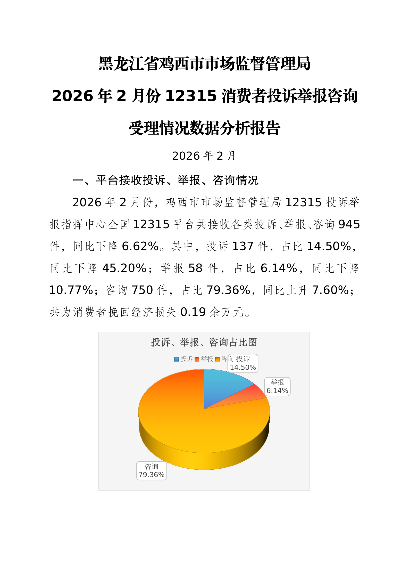 鸡西市市场监督管理局2026年2月份12315消费者投诉举报咨询数据分析报告