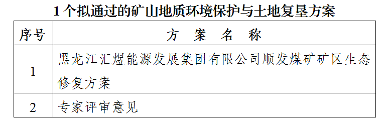 根据《中华人民共和国矿产资源法》《矿山地质环境保护规定》和《土地复垦条例》和《国土资源部办公厅关于做好矿山地质环境保护与土地复垦方案编报有关工作的通知》(国土资规〔2016〕21号)有关要求,经鸡西市矿产资源储量评审中心组织专家对受理的黑龙江汇煜能源发展集团有限公司顺发煤矿1个企业编制的矿区生态修复方案(以下简称“方案”)进行了审查,现将拟同意通过的1个方案和专家意见进行公示,公示期自发布之日起7个工作日。