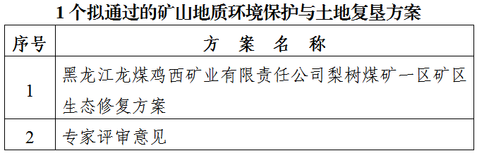 根据《中华人民共和国矿产资源法》《矿山地质环境保护规定》和《土地复垦条例》和《国土资源部办公厅关于做好矿山地质环境保护与土地复垦方案编报有关工作的通知》(国土资规〔2016〕21号)有关要求,经鸡西市矿产资源储量评审中心组织专家对受理的黑龙江龙煤鸡西矿业有限责任公司梨树煤矿一区1个企业编制的矿区生态修复方案(以下简称“方案”)进行了审查,现将拟同意通过的1个方案和专家意见进行公示,公示期自发布之日起7个工作日。