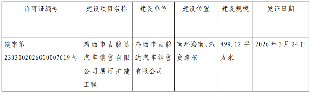 建设工程规划许可证批后公布(证书编号:建字第2303002026GG0007619号)
