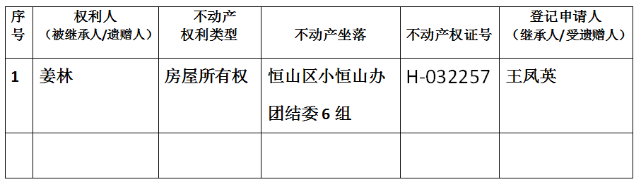 根据《不动产登记暂行条例实施细则》第十四条的规定,经初步查验,不动产登记机构拟对下列不动产权利办理不动产继承登记。根据《不动产登记暂行条例实施细则》第十七条的规定,现予公告。如有异议,请自本公告之日起30天内,将异议书面材料送达不动产登记机构。逾期无人提出异议或者异议不成立的,不动产登记机构将予以登记。