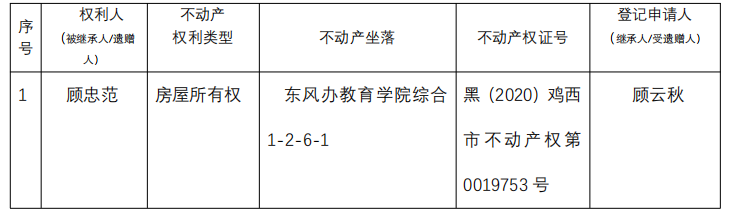 根据《不动产登记暂行条例实施细则》第十四条的规定,经初步查验,不动产登记机构拟对下列不动产权利办理不动产继承登记。根据《不动产登记暂行条例实施细则》第十七条的规定,现予公告。如有异议,请自本公告之日起 30天内,将异议书面材料送达不动产登记机构。逾期无人提出异议或者异议不成立的,不动产登记机构将予以登记。