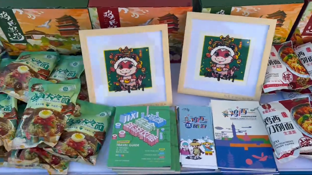 次日的推介会现场,鸡西元素大放异彩。梨树区带来的歌舞创意表演《最美江湖》,以灵动舞姿与悠扬旋律,将鸡西的冰雪豪情与江湖气韵展现得淋漓尽致,赢得现场阵阵掌声。展台区内,特色产品琳琅满目、人气爆棚。恒山区带来的柳毛莲花绿色大米、珈若民主小米、蒲公英红茶等优质农特产品,安山木耳、鹿心粉礼盒等滋补好物,以及工艺扇、鸡西版画等文创精品,彰显了鸡西生态禀赋与文化底蕴;数字经济创意产业园则推出了鸡西冰雪画、鸡西好物礼盒等特色产品,更带来鸡西大冷面、辣白菜、特色辣菜、糖蒜等可试吃美食,地道风味让现场嘉宾赞不绝口,直观传递了鸡西的饮食文化魅力。