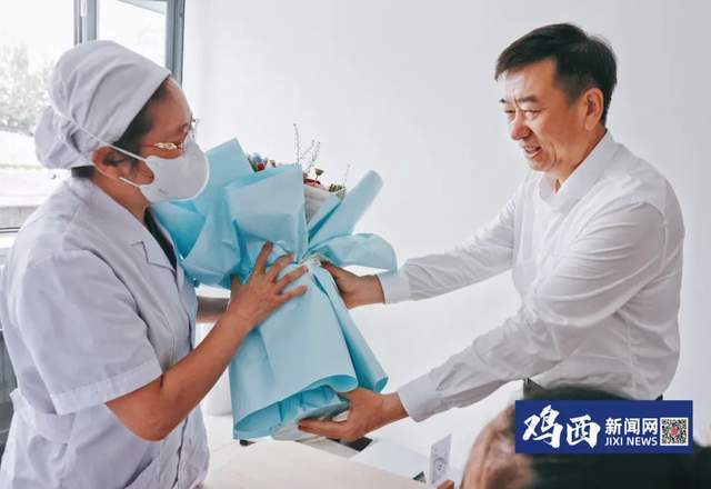 在鸡西市人民医院,孙成坤先后来到门诊大厅和综合内科,为普外一科主任魏立志、心内二科主任金光浩送上鲜花和祝福,并与大家合影留念。他强调,要加强学科建设,锚定群众健康新需求,以科研项目为驱动,精心打造高品质的特色学科、专业学科,全面提升医院的核心竞争力。要打造一流队伍,聚焦“引、育、留、用”关键环节,采取招才引智、名医带徒、组团帮扶等方式,引进培养更多优秀人才,组建优质医疗服务团队。要强化人文关怀,全面落实各项惠医举措,营造尊医重卫良好氛围,不断增强广大医务工作者的荣誉感和幸福感。