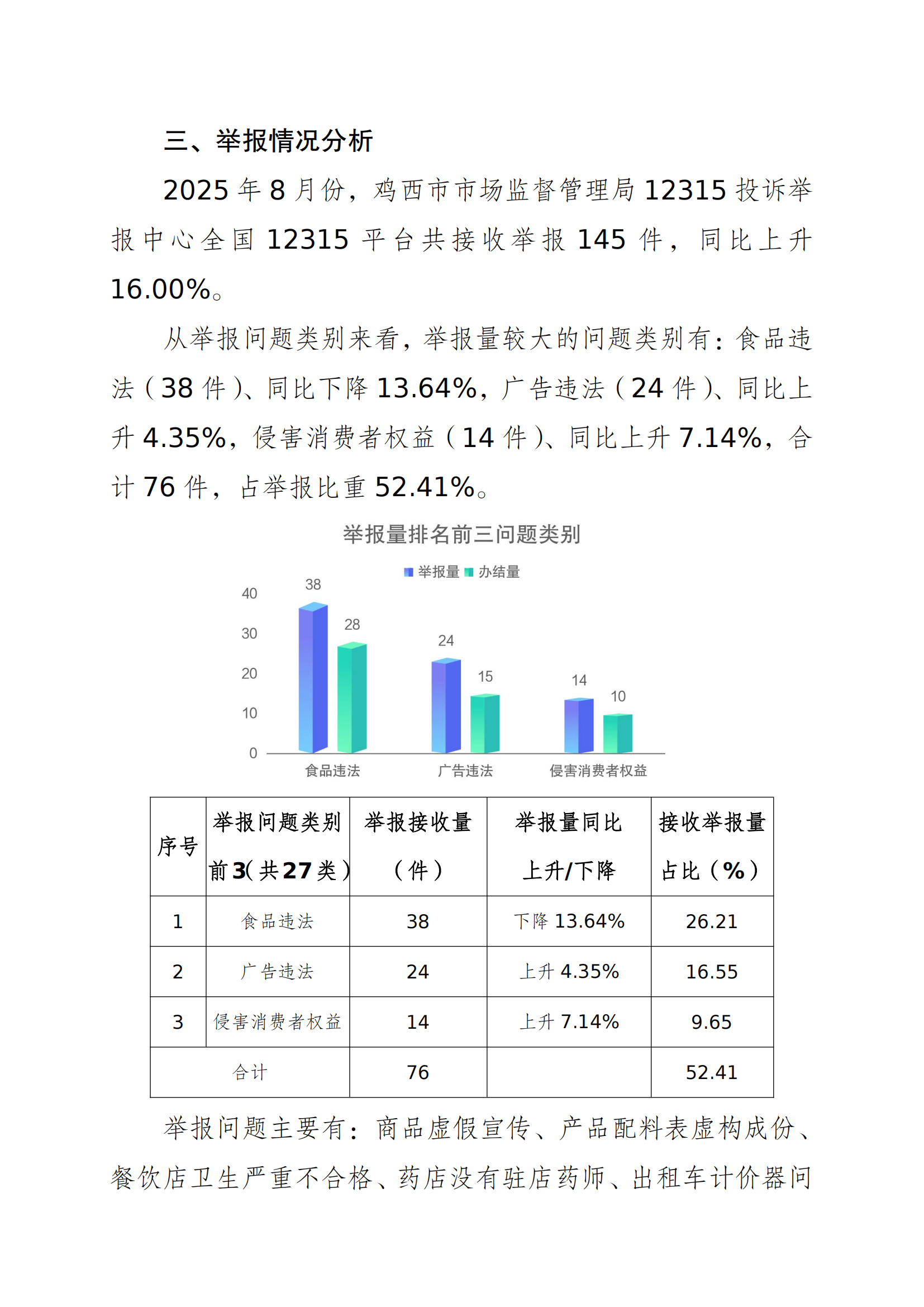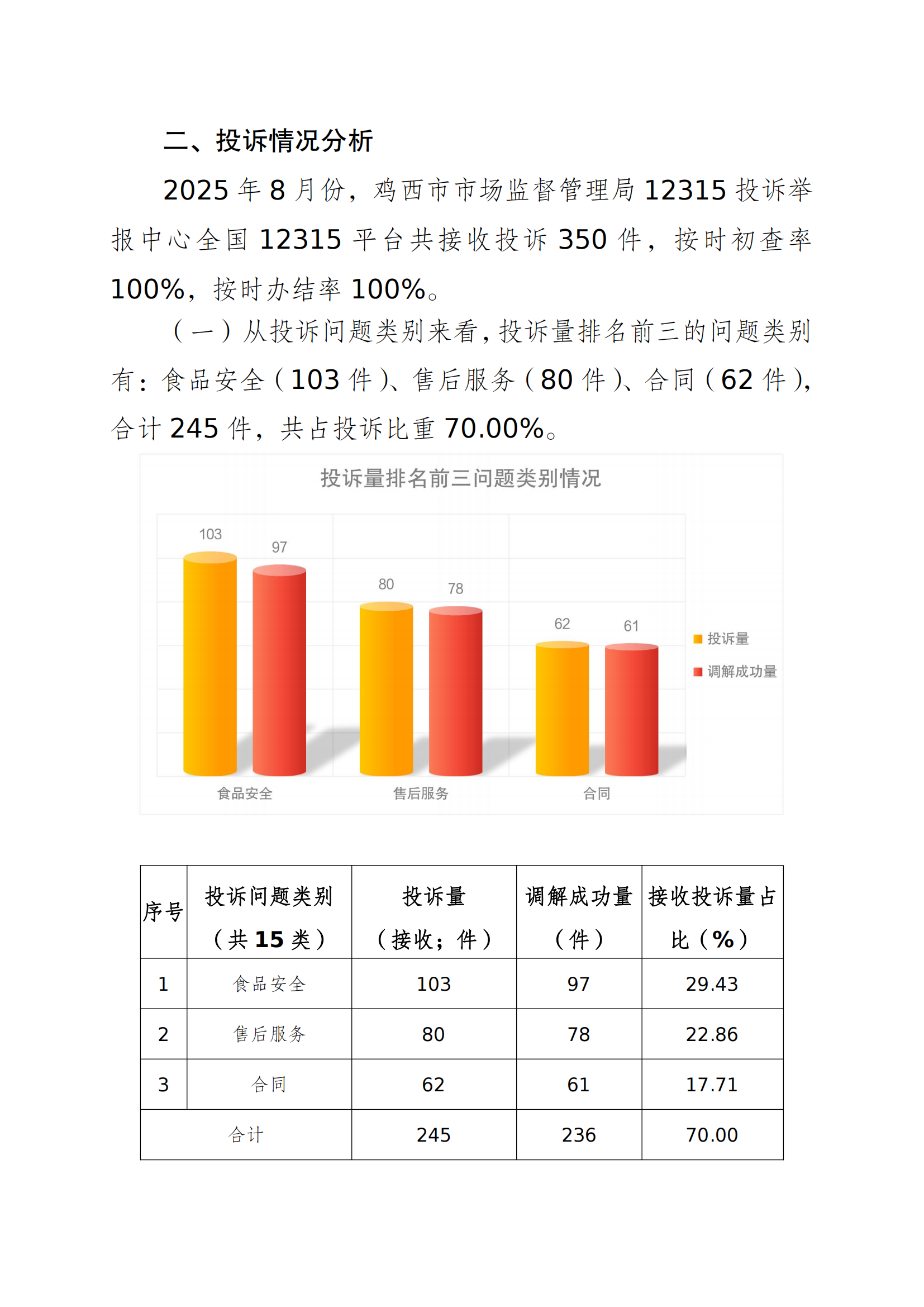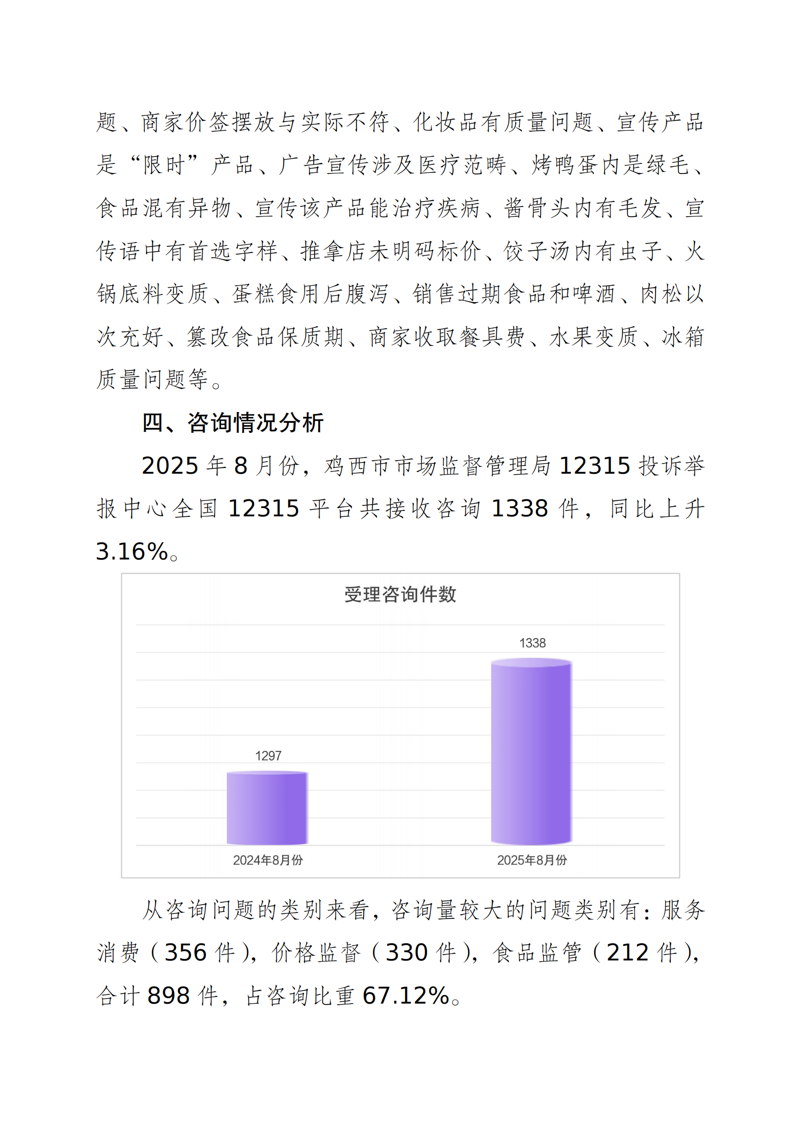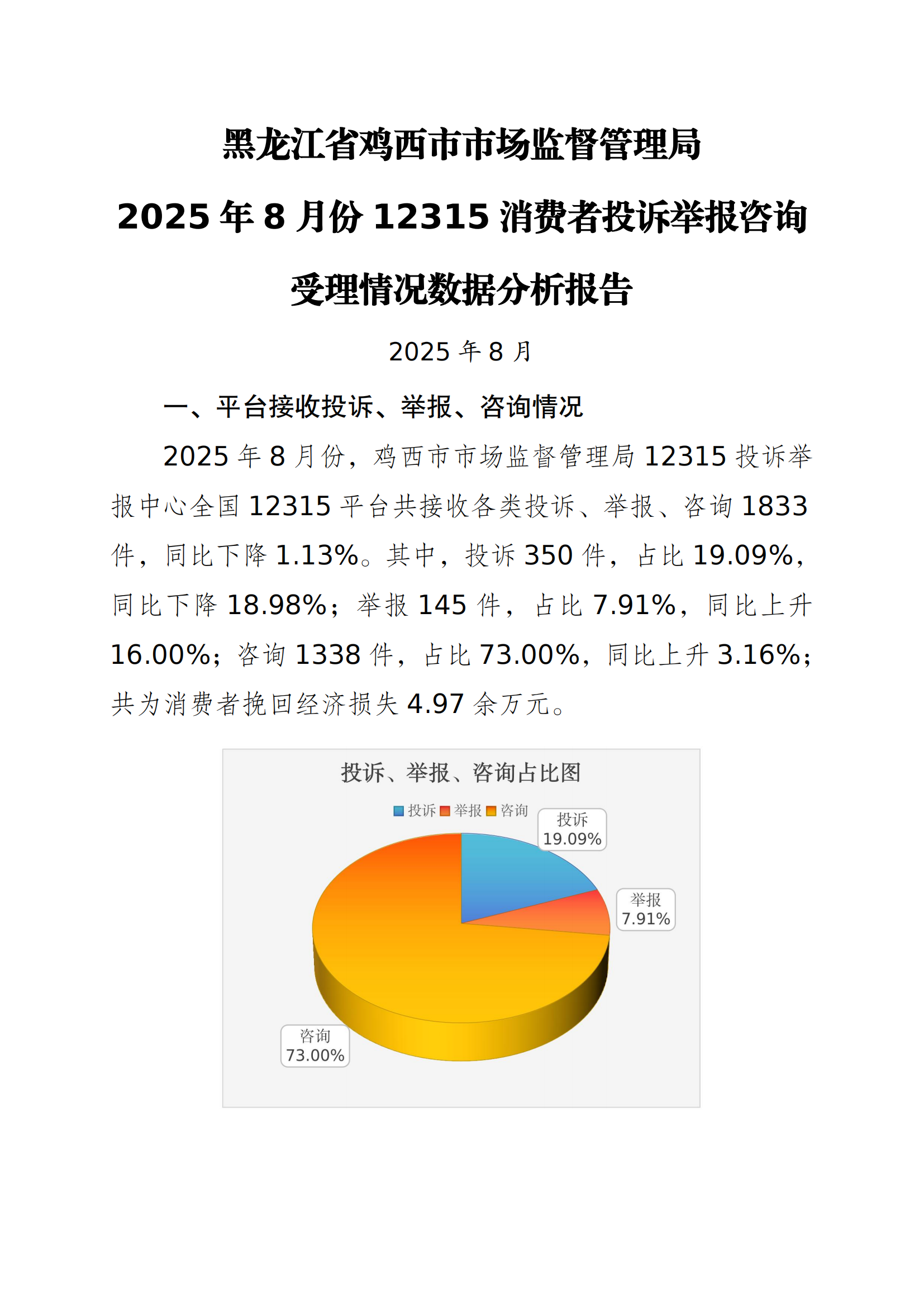 鸡西市市场监督管理局2025年8月份12315消费者投诉举报咨询数据分析报告