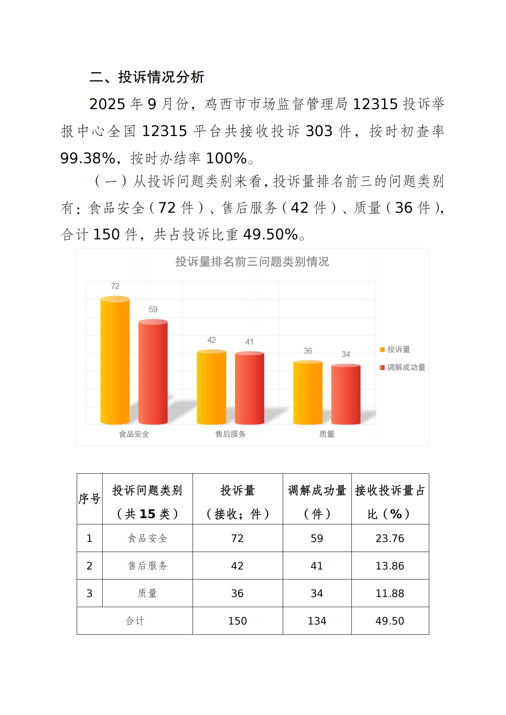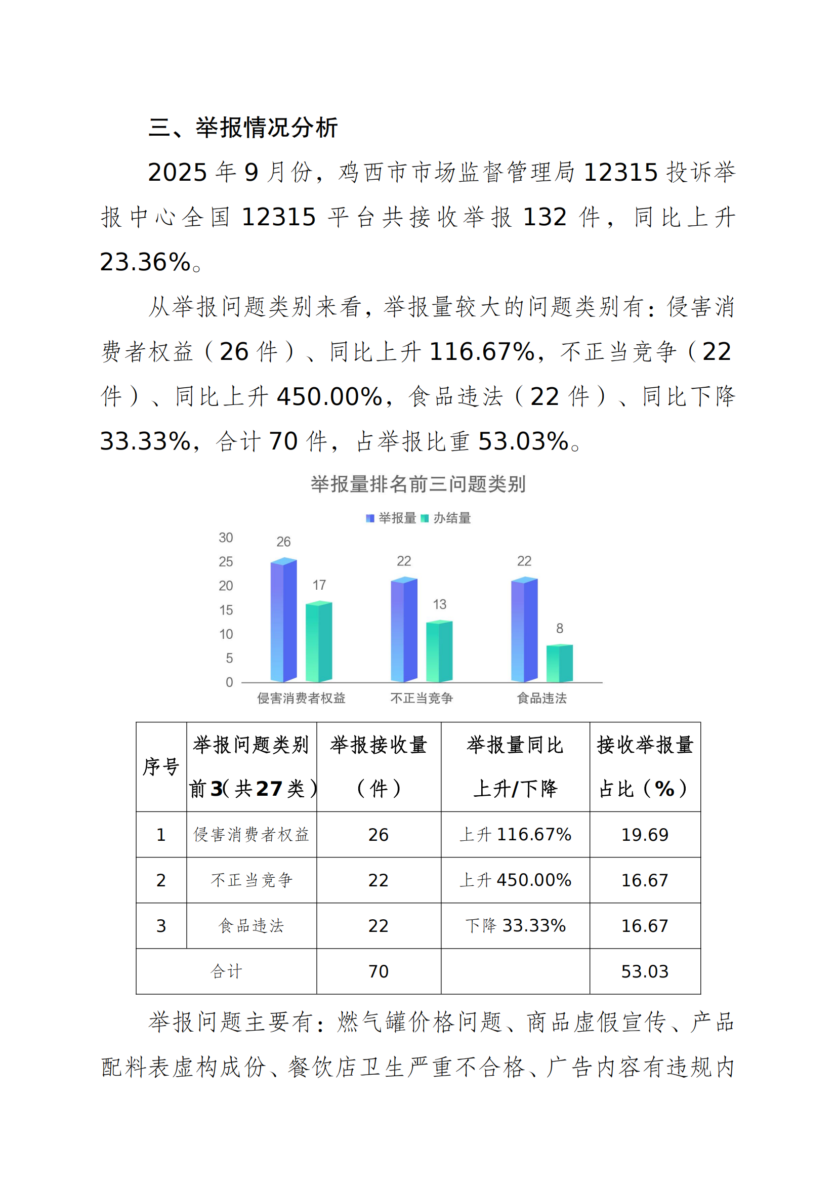 鸡西市市场监督管理局2025年9月份12315消费者投诉举报咨询数据分析报告