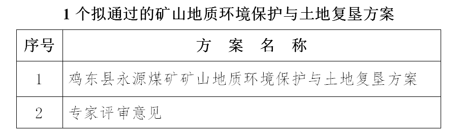 根据《土地复垦条例》《矿山地质环境保护规定》和《国土资源部办公厅关于做好矿山地质环境保护与土地复垦方案编报有关工作的通知》(国土资规〔2016〕21号)有关要求,经鸡西市矿产资源储量评审中心组织专家对受理的鸡东县永源煤矿1个企业编制的矿山地质环境保护与土地复垦方案(以下简称“方案”)进行了审查,现将拟同意通过的1个方案和专家意见进行公示,公示期自发布之日起7个工作日。