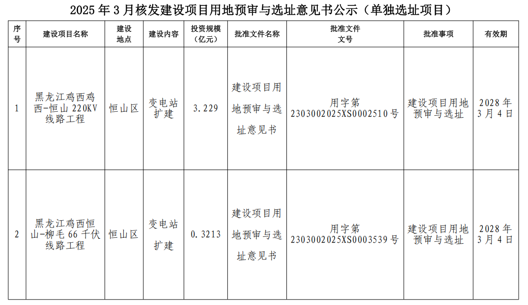 2025年3月核发建设项目用地预审与选址意见书公示(单独选址项目)