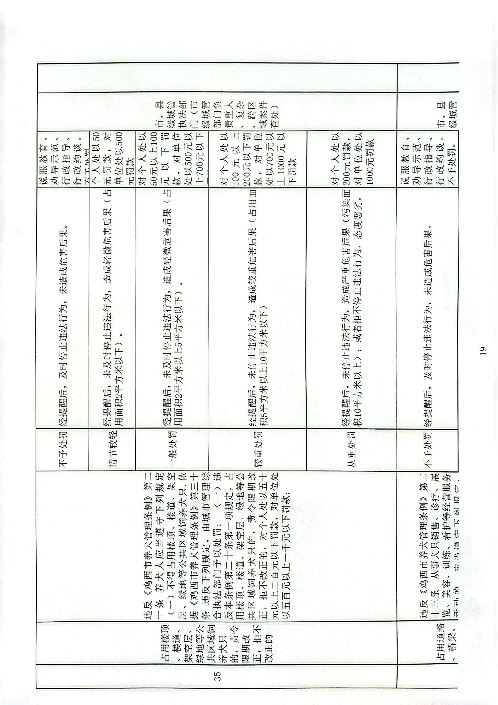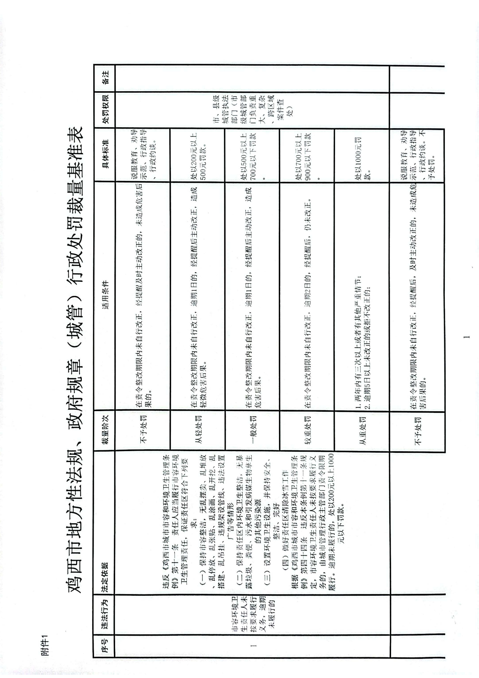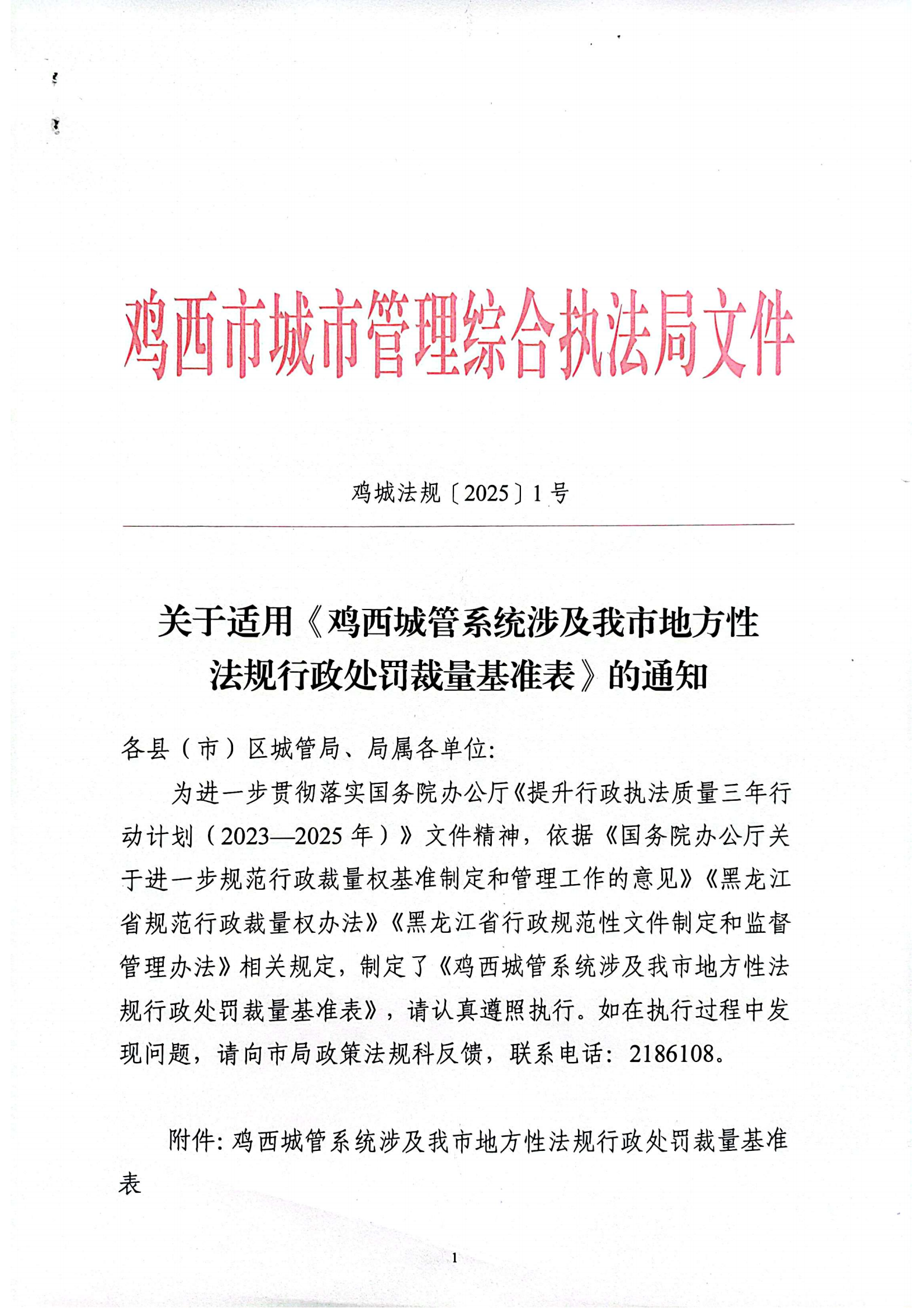 关于适用《鸡西城管系统涉及我市地方性法规行政处罚裁量基准表》的通知