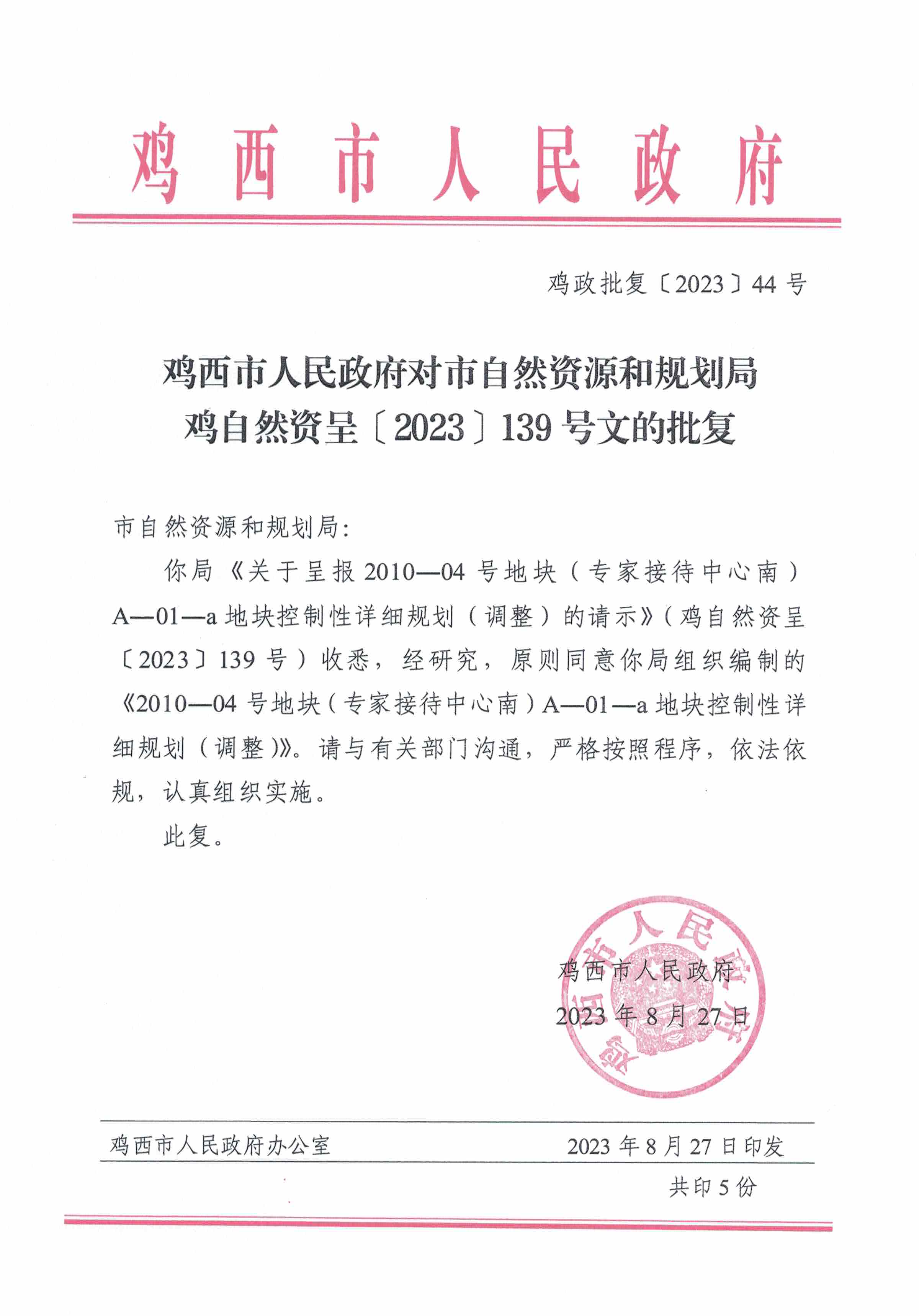 依据《中华人民共和国城乡规划法》第八条及住建部《关于城乡规划公开公示的规定》第九条、第十五条规定,现将鸡西市人民政府依法批准的《2010-04号地块(专家接待中心南)A-01-a地块控制性详细规划(调整)》进行批后公布,公布日期自本公告发布之日起三十日。