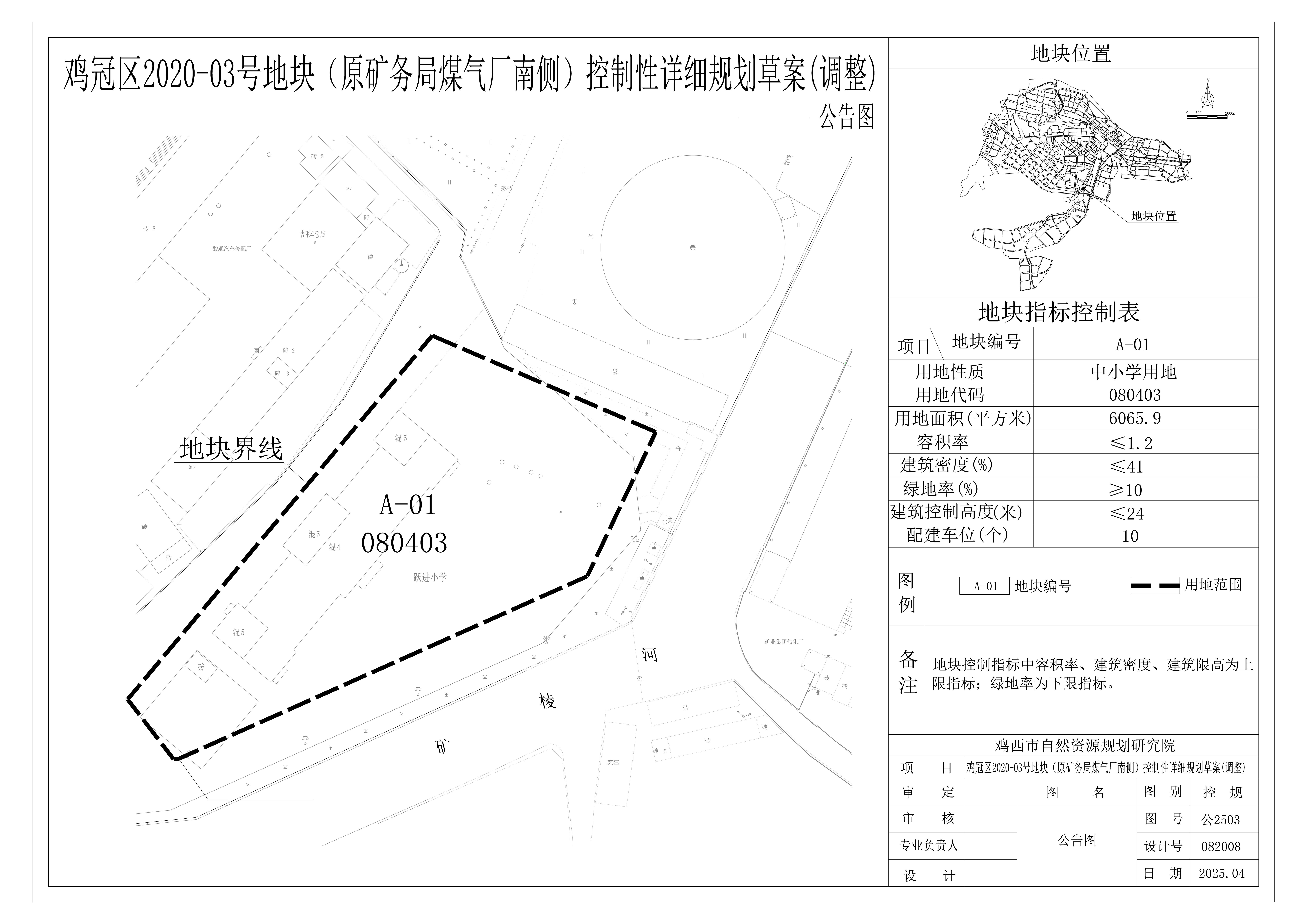 为了积极推动公众参与城市规划,确保城市规划科学合理,现将《鸡冠区2020-03号地块(原矿务局煤气厂南侧)控制性详细规划草案(调整)》进行审批前公告,欢迎社会各界提出意见和建议。如有意见和建议的,请在公告期内,及时向鸡西市自然资源和规划局反馈。如申请听证请在公告期内,到鸡西市自然资源和规划局国土空间规划科登记,我局将组织召开座谈会。现将有关事项公告如下 :