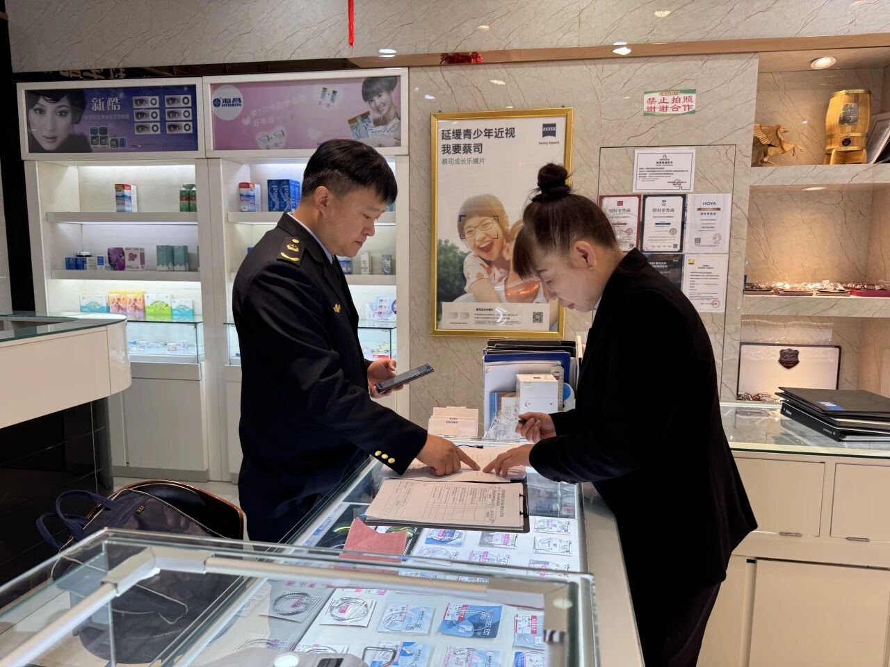 精准定位,排查风险隐患。本次行动坚持问题导向,实施精准化监管。以市内各大商场、医院、学校周边的配镜中心、眼镜店、视力防控机构为核心检查范围,并将监管触角延伸至美团、饿了么、京东等线上销售平台,实现线上线下同步排查。紧盯角膜接触镜(含装饰性彩色隐形眼镜)及其护理产品、角膜塑形镜(OK镜)、近视治疗仪、视力训练设备等产品,严格核查产品注册证、供货方资质及购销渠道的合法性,从源头把好质量关。同时,深入检查经营企业的进货查验记录、贮存养护条件、销售记录台账等,严厉打击“无证经营”“超范围经营”和销售“来源不明”产品等违法行为。