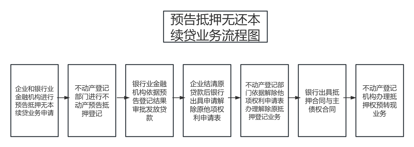 企业和银行业金融机构进行预告抵押无本续贷业务申请后不动产登记部门进行不动产预告抵押登记,银行业金融机构依据预告登记结果审批发放贷款,企业结清原贷款后银行出具申请解除原他项权利申请表,不动产登记部门依据解除他项权利申请表办理解除原抵押登记业务,银行出具抵押合同与主债权合同,不动产登记机构办理抵押权预转现业务。