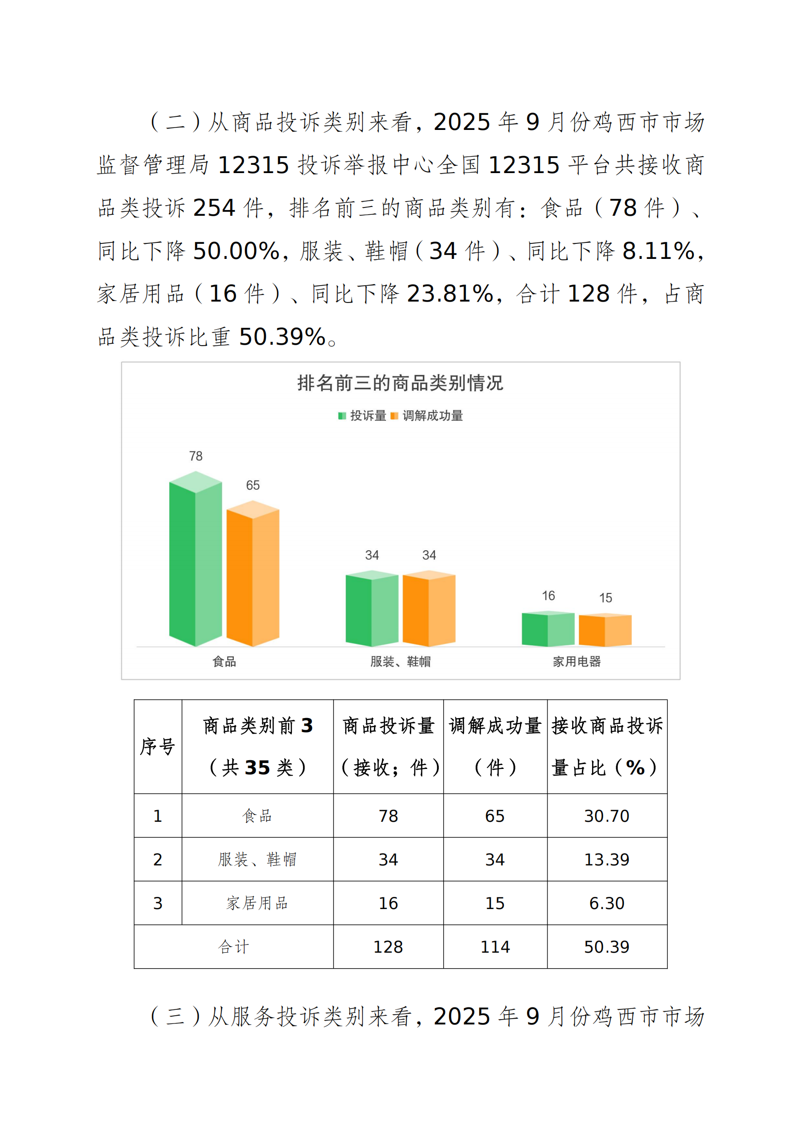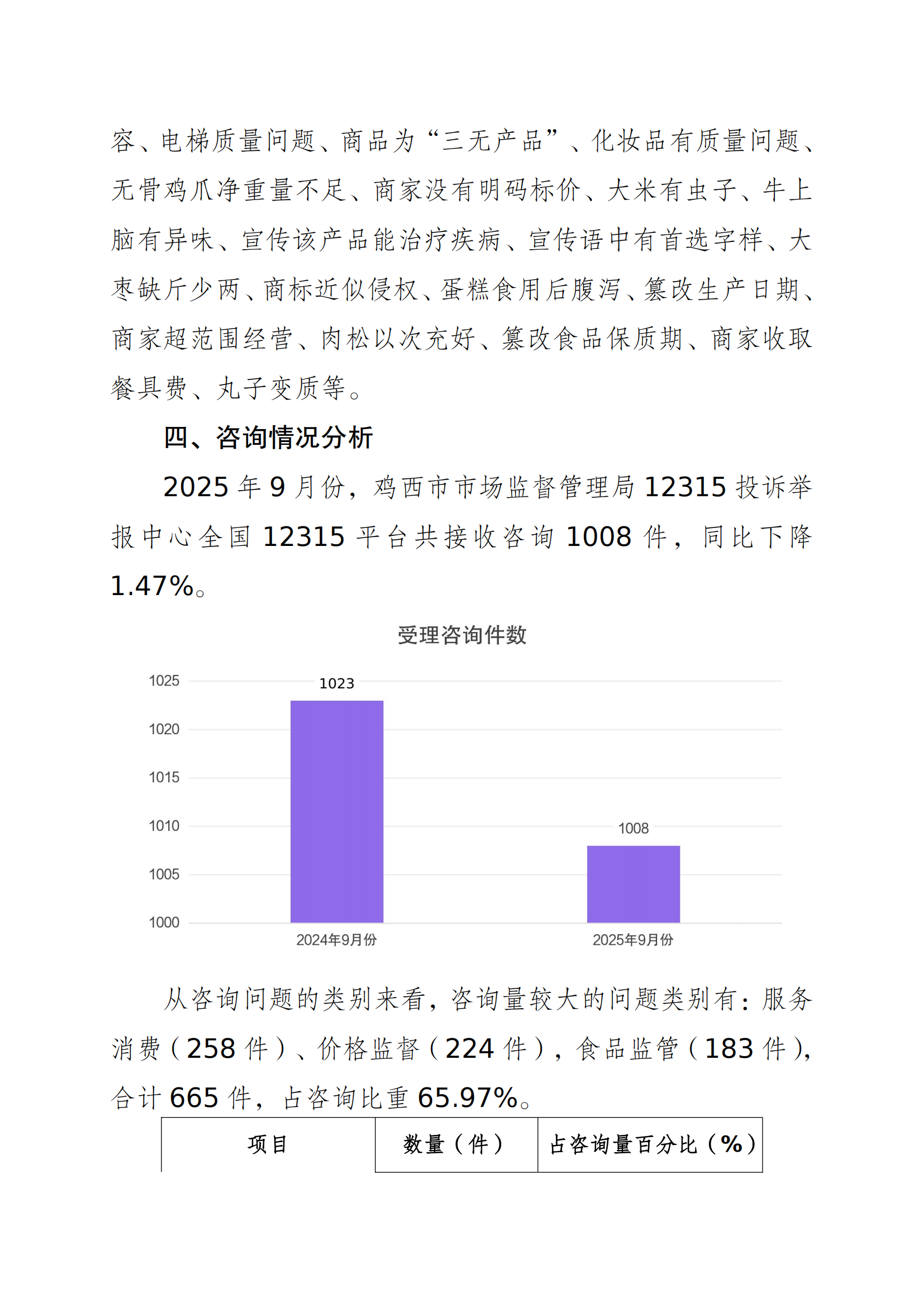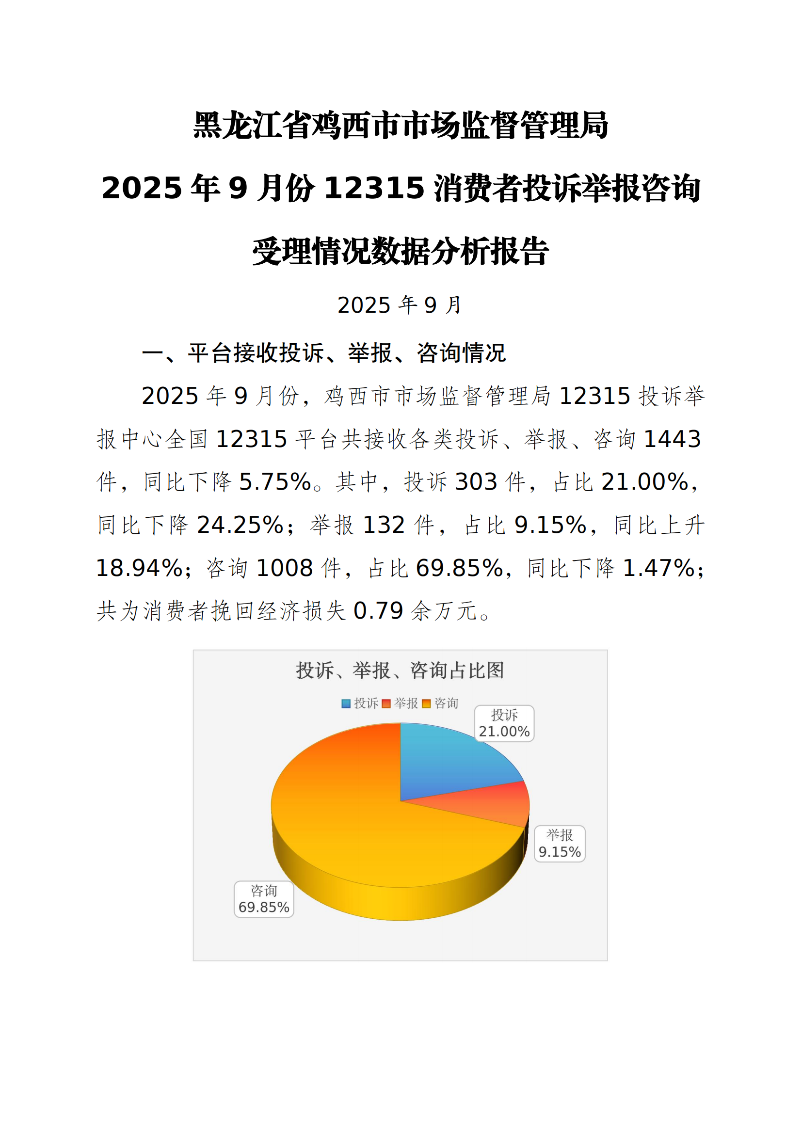 鸡西市市场监督管理局2025年9月份12315消费者投诉举报咨询数据分析报告