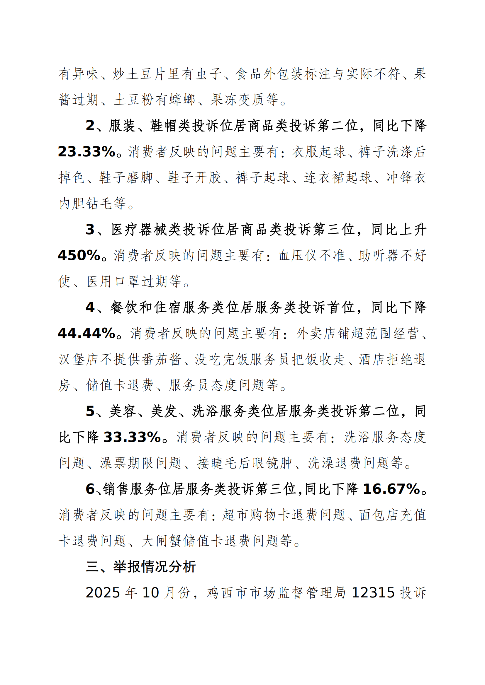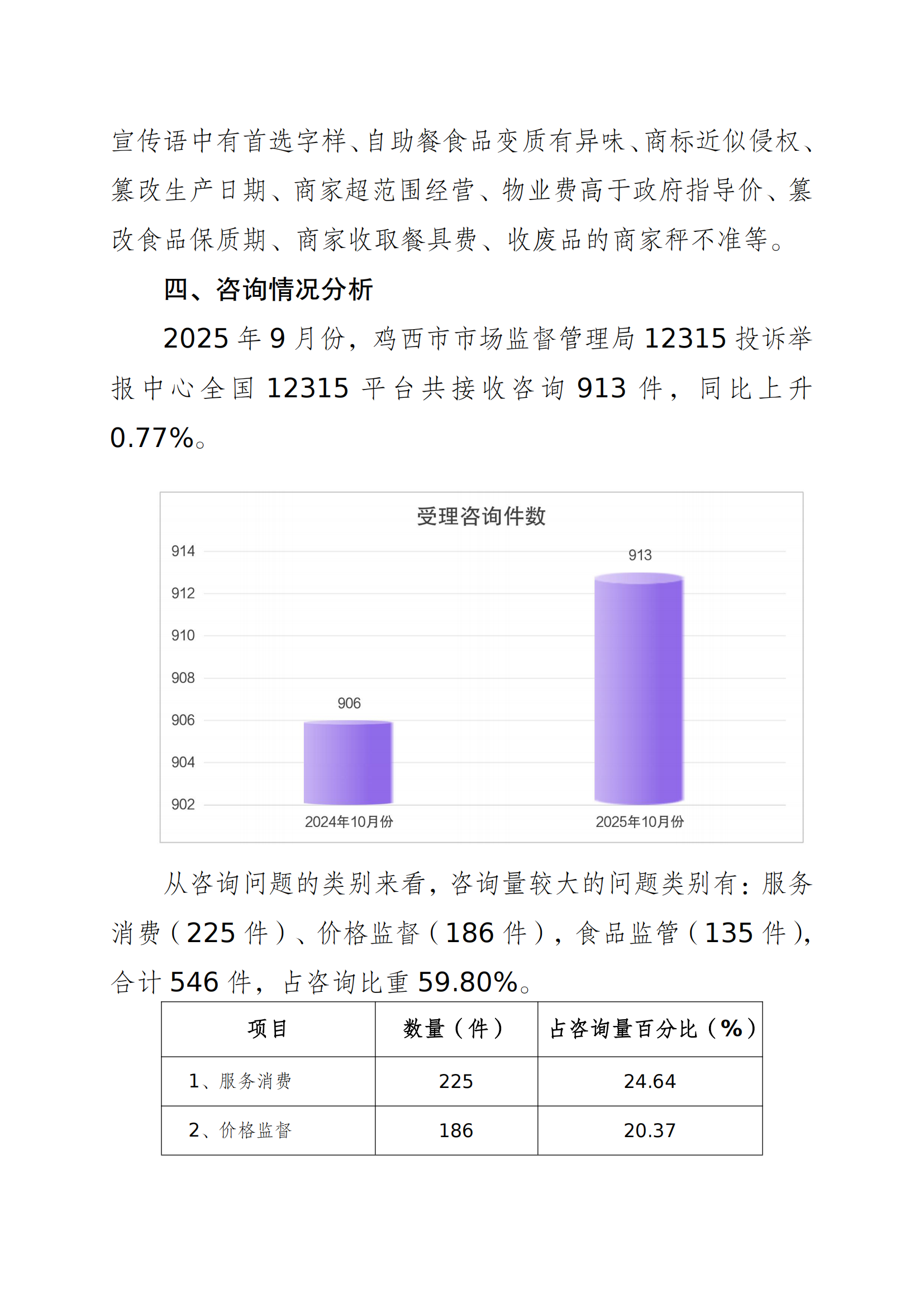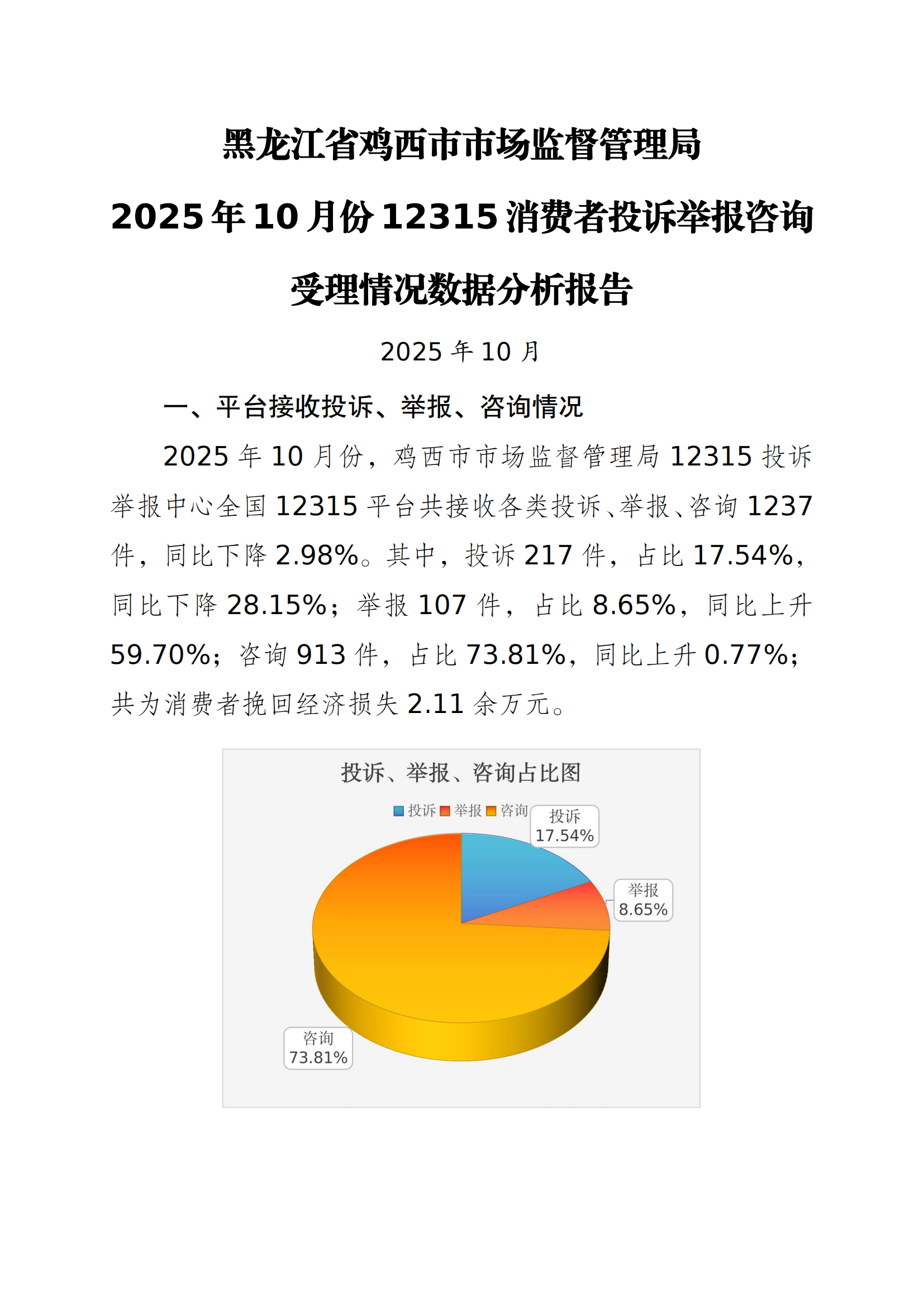 鸡西市市场监督管理局2025年10月份12315消费者投诉举报咨询数据分析报告