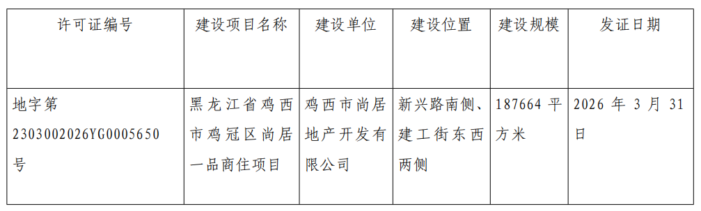 建设用地规划许可证批后公布(证书编号:地字第2303002026YG0005650号)