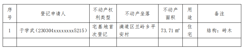 登记机构:鸡西市不动产登记中心滴道不动产登记办公室