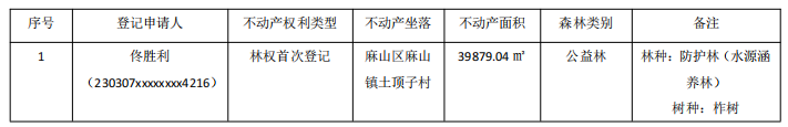 编号:M2025110606 经初步审定,我机构拟对下列不动产权利予以首次登记,根据《不动产登记暂行条例实施细则》第十七条的规定,现予以公告。如有异议,请自本公告之日起十五个工作日内(2025 年 11 月 26 日之前)将异议书面材料送达我机构。逾期无人提出异议或着异议不成立的,我机构将予以登记。 异议书面材料送达地址:麻山区政务大厅 1 楼 联系方式:2491229
