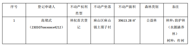 编号:M2025110603 经初步审定,我机构拟对下列不动产权利予以首次登记,根据《不动产登记暂行条例实施细则》第十七条的规定,现予以公告。如有异议,请自本公告之日起十五个工作日内(2025 年 11 月 26 日之前)将异议书面材料送达我机构。逾期无人提出异议或着异议不成立的,我机构将予以登记。 异议书面材料送达地址:麻山区政务大厅 1 楼 联系方式:2491229