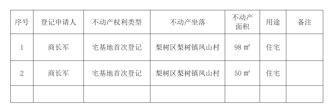 经初步审定,我机构拟对下列不动产权利予以首次登记,根据《不动产登记暂行条例实施细则》第十七条的规定,现予公告。如有异议,请自本公告之日起十五个工作日内(2026年 03 月 16 日之前)将异议书面材料送达我机构。逾期无人提出异议或者异议不成立的,我机构将予以登记。 异议书面材料送达地址:梨树区七道街政务服务中心二 楼 联系方式:8232766