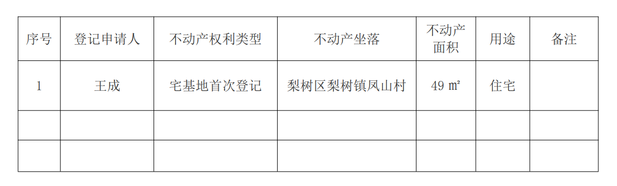 经初步审定,我机构拟对下列不动产权利予以首次登记,根据《不动产登记暂行条例实施细则》第十七条的规定,现予公告。如有异议,请自本公告之日起十五个工作日内(2026年 03 月 16 日之前)将异议书面材料送达我机构。逾期无人提出异议或者异议不成立的,我机构将予以登记。异议书面材料送达地址:梨树区七道街政务服务中心二楼 联系方式:8232766