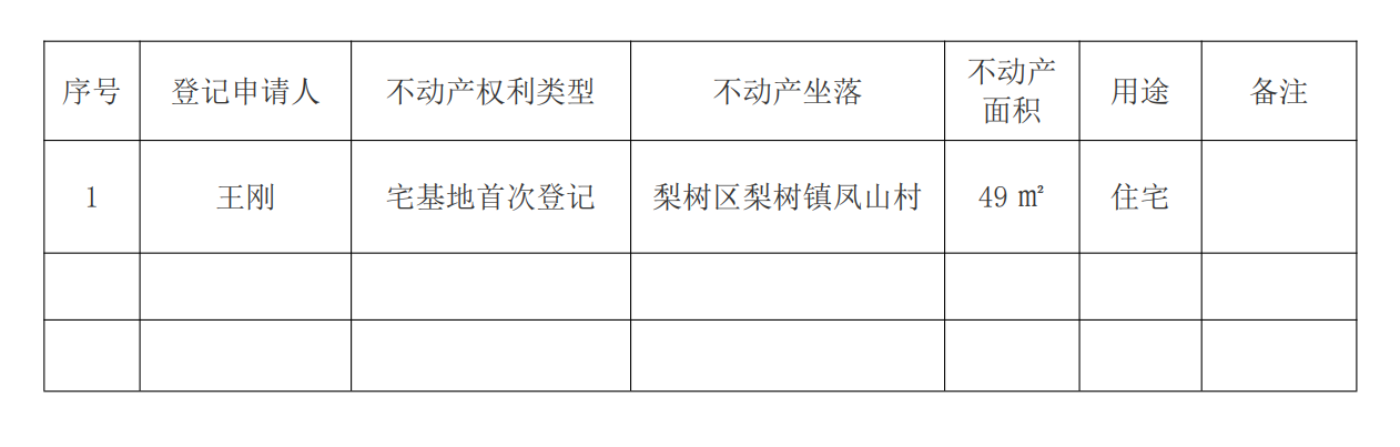 经初步审定,我机构拟对下列不动产权利予以首次登记,根据《不动产登记暂行条例实施细则》第十七条的规定,现予公告。如有异议,请自本公告之日起十五个工作日内(2026年 03 月 16 日之前)将异议书面材料送达我机构。逾期无人提出异议或者异议不成立的,我机构将予以登记。