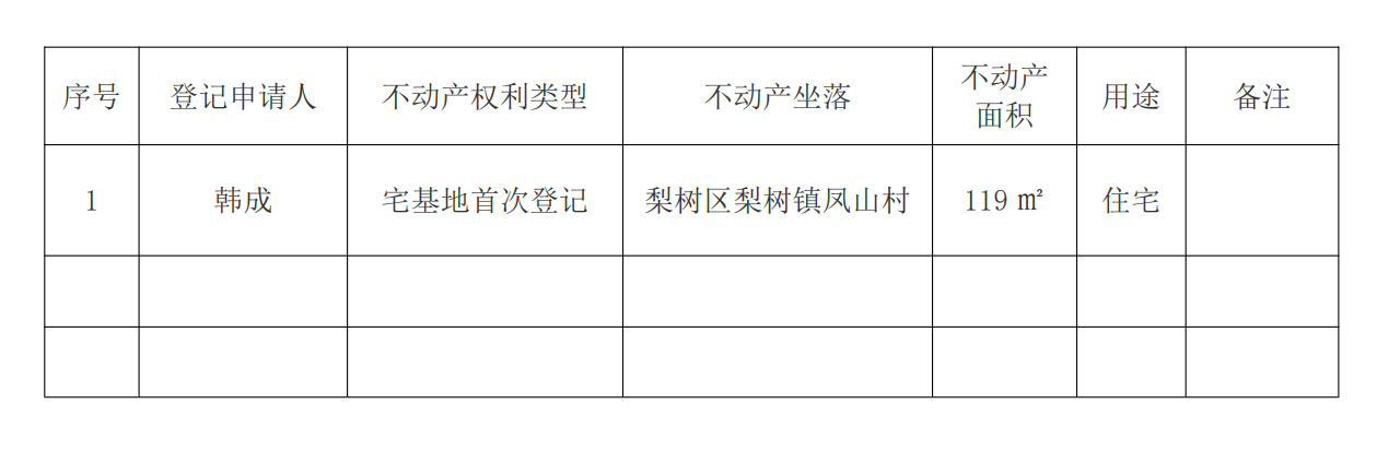 经初步审定,我机构拟对下列不动产权利予以首次登记,根据《不动产登记暂行条例实施细则》第十七条的规定,现予公告。如有异议,请自本公告之日起十五个工作日内(2026年 03 月 16 日之前)将异议书面材料送达我机构。逾期无人提出异议或者异议不成立的,我机构将予以登记。 异议书面材料送达地址:梨树区七道街政务服务中心二楼 联系方式:8232766