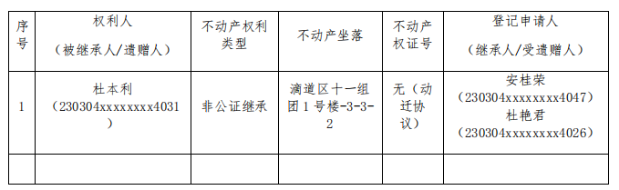 根据《不动产登记暂行条例实施细则》第十四条的规定,经初步查验,不动产登记机构拟对下列不动产办理不动产继承登记。根据《不动产登记暂行条例实施细则》第十七条规定,现予以公告。如有异议,请自本公告之日起三十日内,将异议书面材料送达不动产登记机构。逾期无人提出异议或者异议不成立的,不动产登记机构将予以登记。