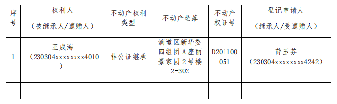 根据《不动产登记暂行条例实施细则》第十四条的规定,经初步查验,不动产登记机构拟对下列不动产办理不动产继承登记。根据《不动产登记暂行条例实施细则》第十七条规定,现予以公告。如有异议,请自本公告之日起三十日内,将异议书面材料送达不动产登记机构。逾期无人提出异议或者异议不成立的,不动产登记机构将予以登记。