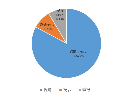 从咨询范围来看,涉及市场监督管理业务的咨询3620件,占咨询总量的95.62%。其中,排行前两位为:商品质量类1551件、服务消费类1249件,分别占咨询总量的40.97%、32.99%;涉及非市场监督管理业务的咨询166件,占咨询总量的4.38%。排行前两位为:其他行政部门86件、检测机构52件,分别占咨询总量的2.27%、1.37%(见图3)。