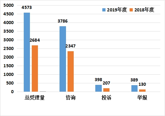 2019年,鸡西市市场监督管理局12315热线平台接到消费者咨询、投诉、举报共计4573个,同比上升70.38%。本年度解答消费咨询3786件,占受理总量的82.79%,同比上升61.31%,全部予以及时解答;受理投诉398件,占受理总量的8.7%,同比增长92.27%,已办结398件,办结率为100%,为消费者挽回经济损失124.87万元;受理群众举报389件,占受理总量的8.51%,同比增长199.23%,已办结389件,办结率100%。