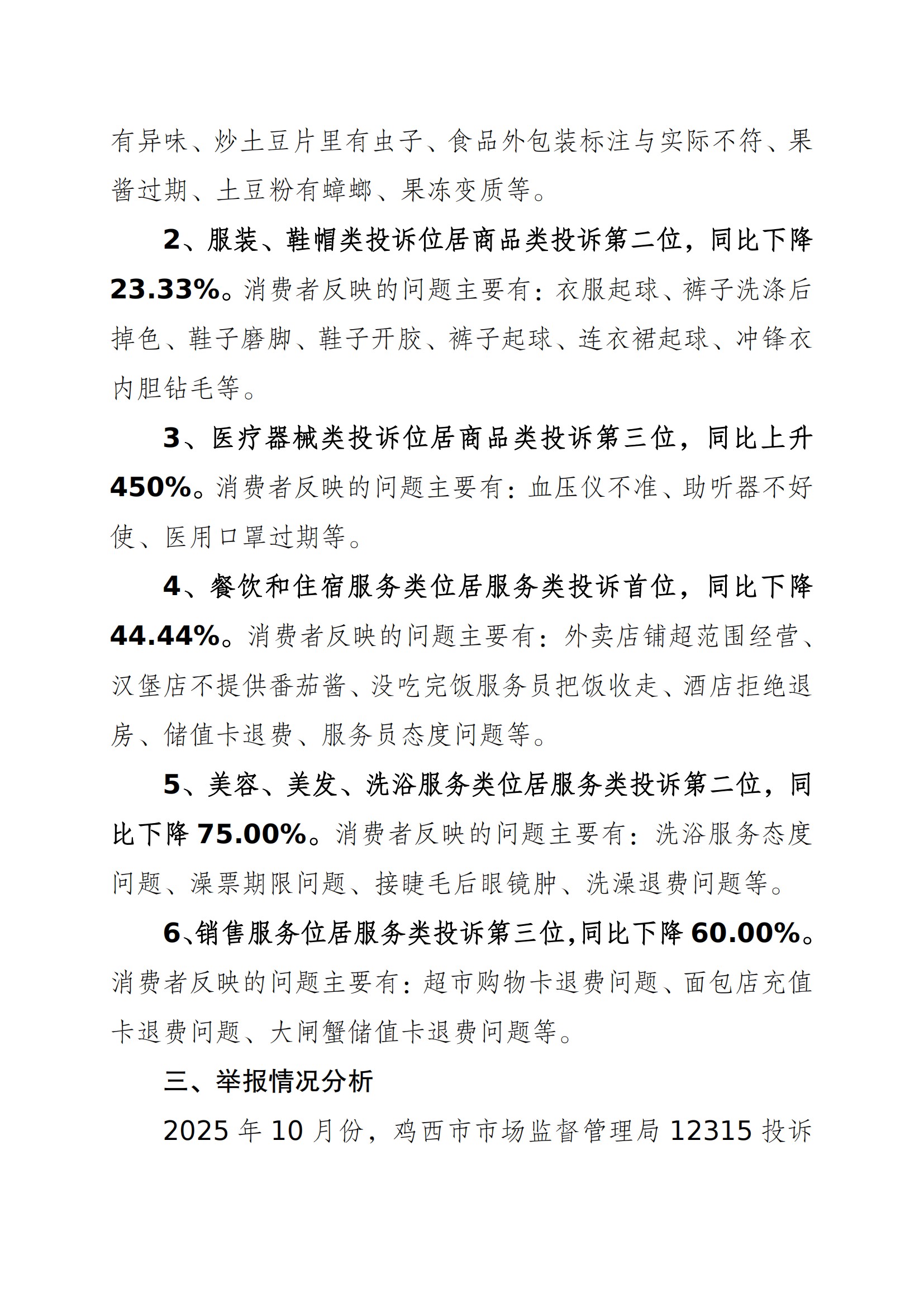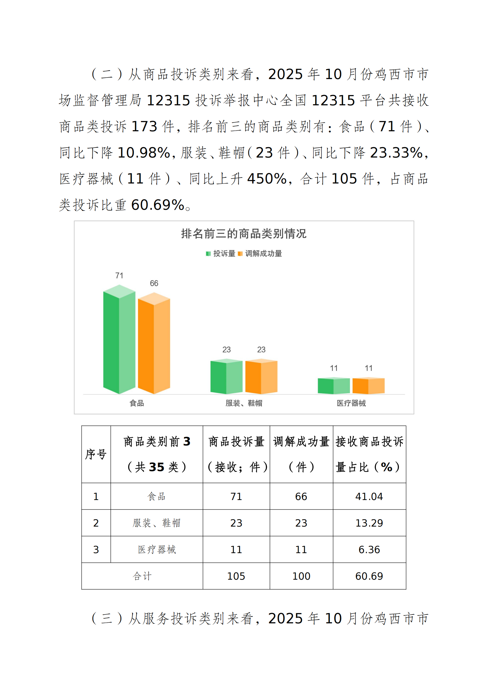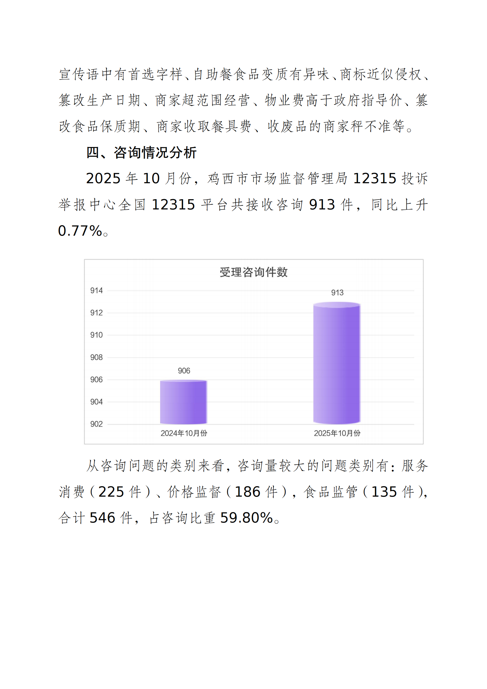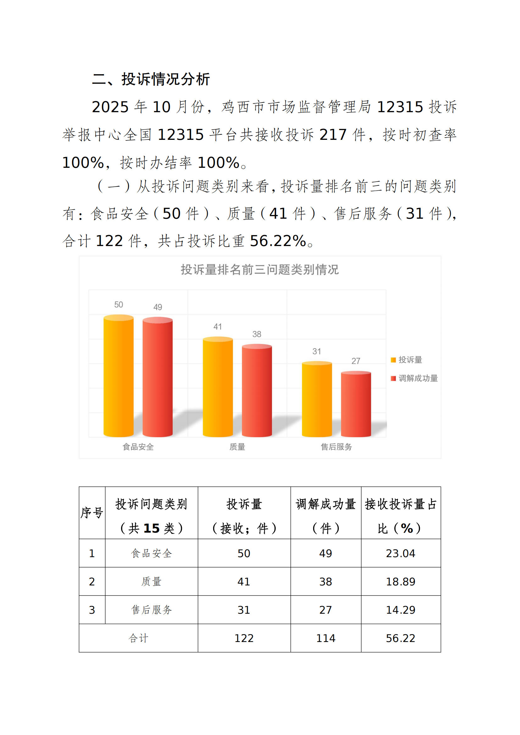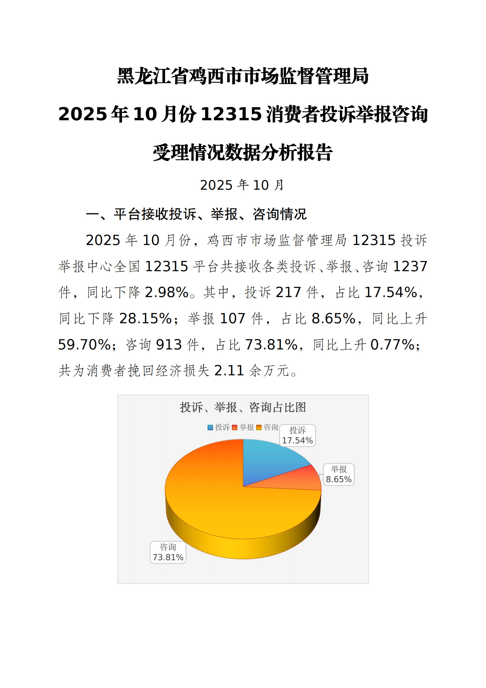 鸡西市市场监督管理局2025年10月份12315消费者投诉举报咨询数据分析报告