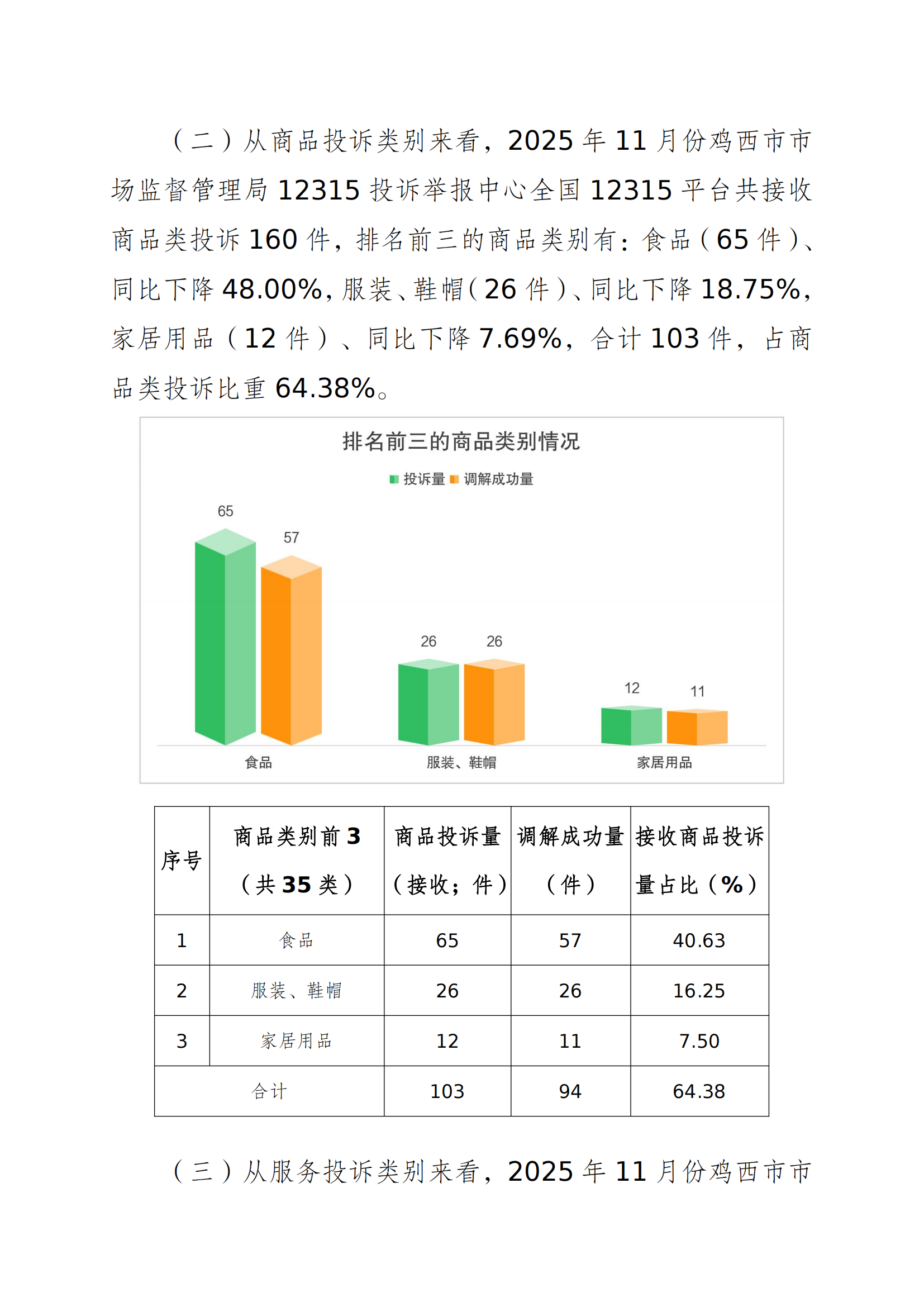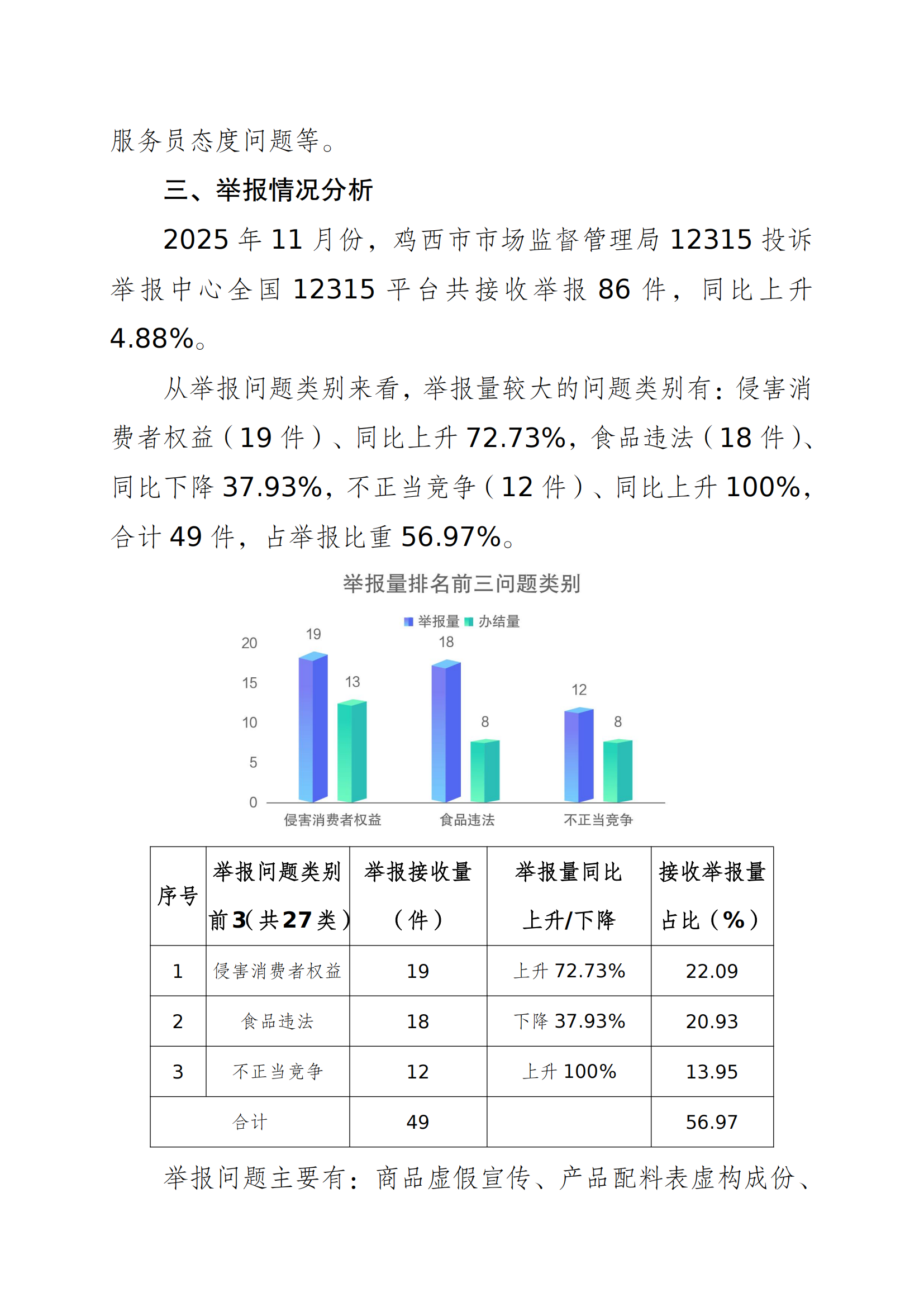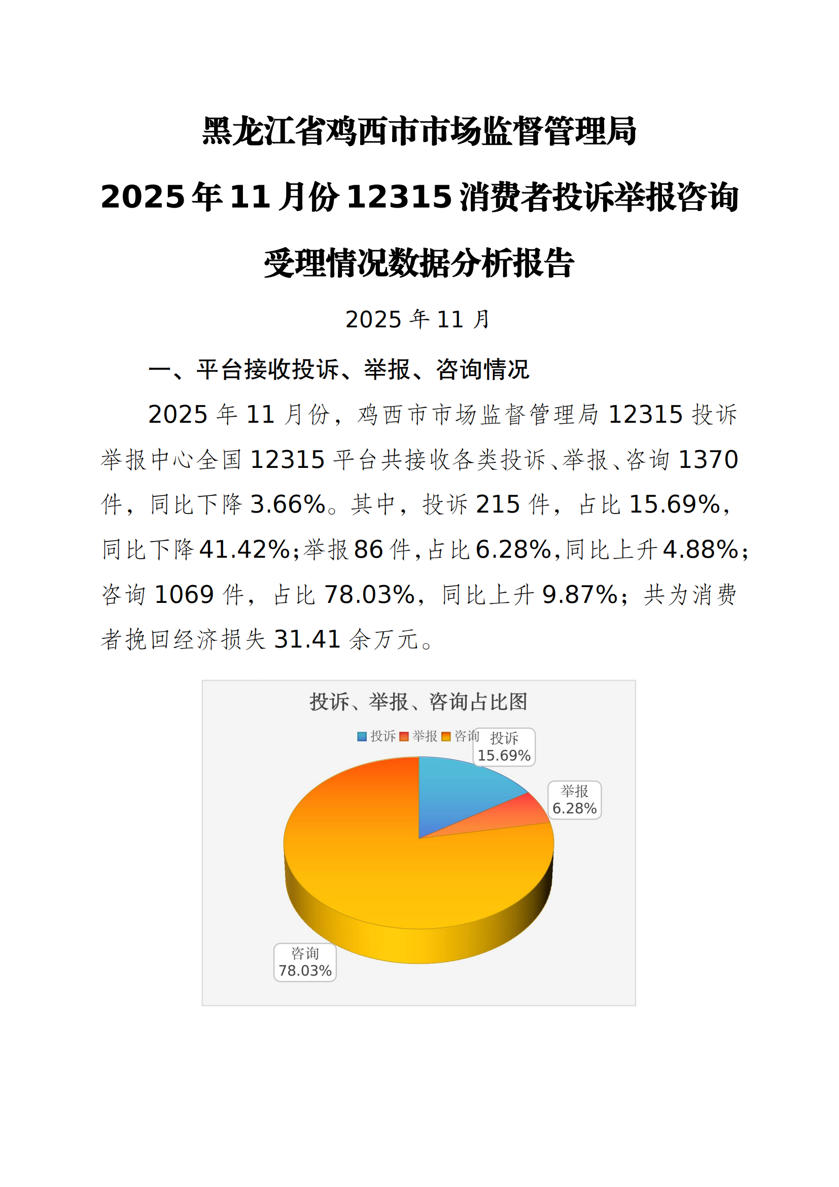 鸡西市市场监督管理局2025年11月份12315消费者投诉举报咨询数据分析报告