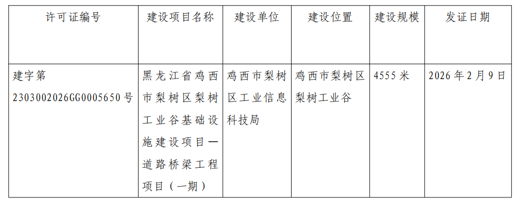 建设工程规划许可证批后公布(证书编号:建字第2303002026GG0005650号)