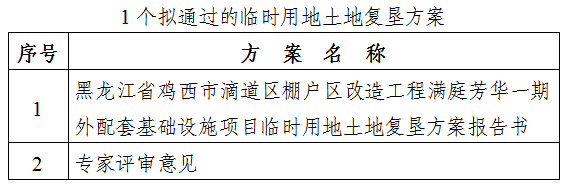 根据《土地复垦条例》有关要求,我局委托鸡西市矿产资源储量评审中心组织专家对《黑龙江省鸡西市滴道区棚户区改造工程满庭芳华一期外配套基础设施项目临时用地土地复垦方案报告书》(以下简称“方案”)进行了审查。现将拟同意通过的“方案”和专家评审意见进行公示,公示日期自发布之日起7个工作日。