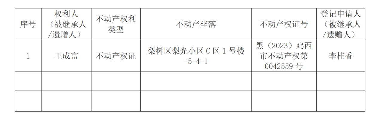 根据《不动产登记暂行条例实施细则》第十四条的规定,经初步查验,不动产登记机构拟对下列不动产权利办理不动产继承登记。根据《不动产登记暂行条例实施细则》第十七条的规定,现予公告。如有异议,请自本公告起 15 个工作日内,将异议书面材料送达不动产登记机构。逾期无人提出异议或者异议不成立的,不动产登记机构将予以登记。