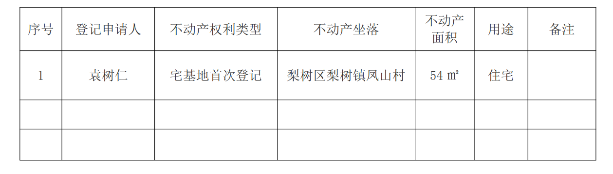 经初步审定,我机构拟对下列不动产权利予以首次登记,根据《不动产登记暂行条例实施细则》第十七条的规定,现予公告。如有异议,请自本公告之日起十五个工作日内(2026年 05 月 15 日之前)将异议书面材料送达我机构。逾期无人提出异议或者异议不成立的,我机构将予以登记。异议书面材料送达地址:梨树区七道街政务服务中心二楼 联系方式:8232766
