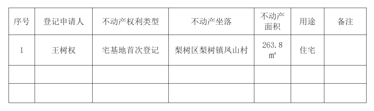经初步审定,我机构拟对下列不动产权利予以首次登记,根据《不动产登记暂行条例实施细则》第十七条的规定,现予公告。如有异议,请自本公告之日起十五个工作日内(2026年 05 月 15 日之前)将异议书面材料送达我机构。逾期无人提出异议或者异议不成立的,我机构将予以登记。 异议书面材料送达地址:梨树区七道街政务服务中心二楼
