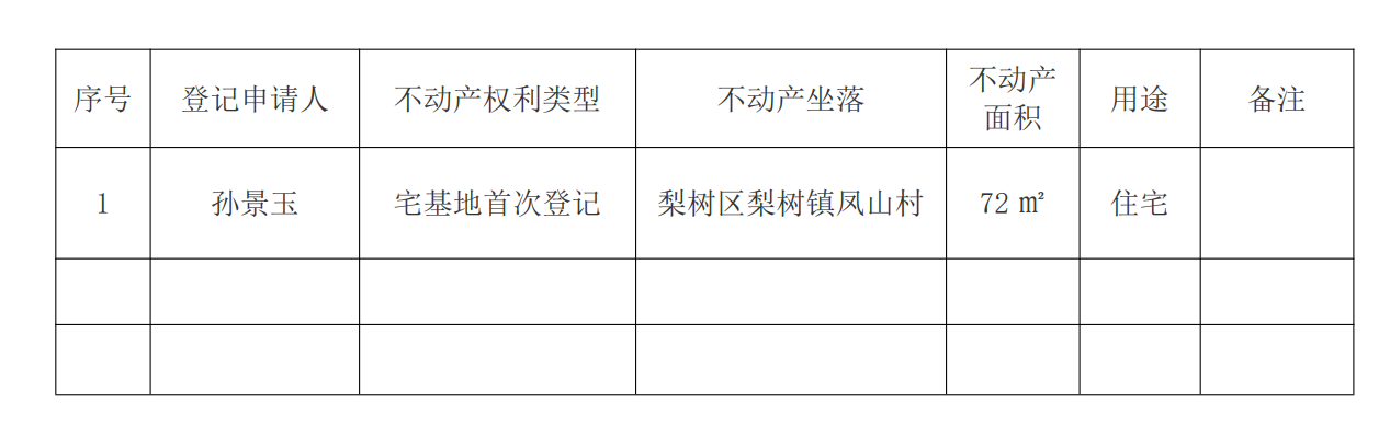 经初步审定,我机构拟对下列不动产权利予以首次登记,根据《不动产登记暂行条例实施细则》第十七条的规定,现予公告。如有异议,请自本公告之日起十五个工作日内(2026年 05 月 15 日之前)将异议书面材料送达我机构。逾期无人提出异议或者异议不成立的,我机构将予以登记。 异议书面材料送达地址:梨树区七道街政务服务中心二楼 联系方式:8232766