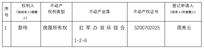 根据《不动产登记暂行条例实施细则》第十四条的规定,经初步查验,不动产登记机构拟对下列不动产权利办理不动产继承登记。根据《不动产登记暂行条例实施细则》第十七条的规定,现予公告。如有异议,请自本公告之日起 30天内,将异议书面材料送达不动产登记机构。逾期无人提出异议或者异议不成立的,不动产登记机构将予以登记。