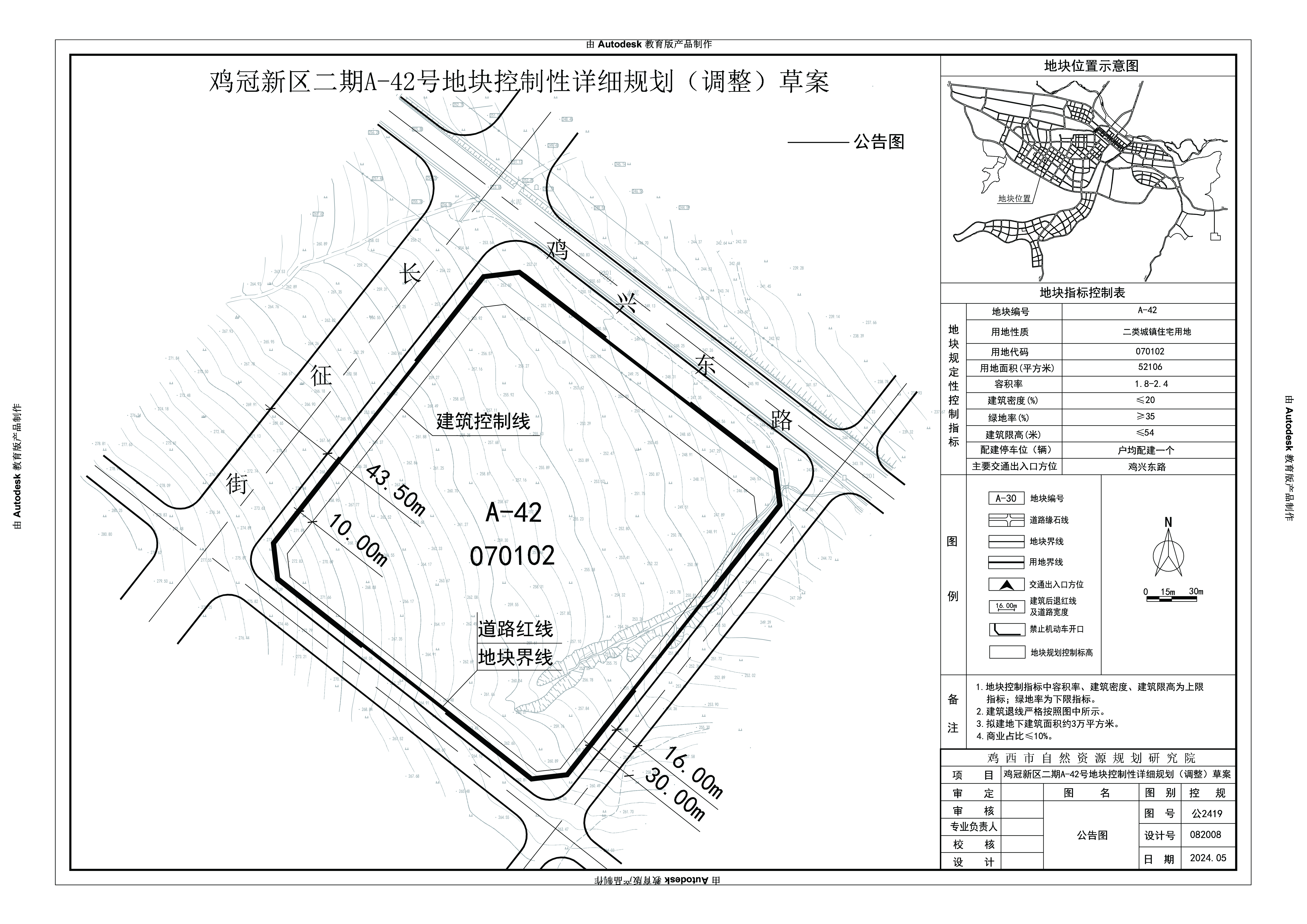 为了积极推动公众参与城市规划,确保城市规划科学合理,现将《鸡冠新区二期A-42号地块控制性详细规划(调整)草案》进行审批前公告,欢迎社会各界提出意见和建议。如有意见和建议的,请在公告期内,及时向鸡西市自然资源和规划局反馈。如申请听证请在公告期内,到鸡西市自然资源和规划局国土空间规划科登记,我局将组织召开座谈会。现将有关事项公告如下 :