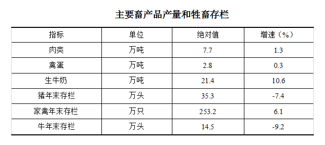 全年肉类总产量7.7万吨,同比增长1.3%;禽蛋产量2.8万吨,同比增长0.3%;生牛奶产量21.4万吨,同比增长10.6%;水产品产量5.3万吨,增长5.0%。