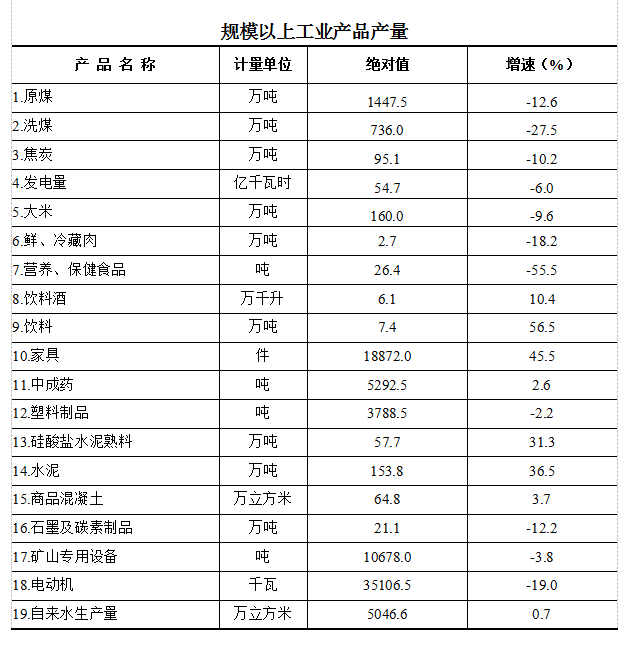 列入统计目录的19种主要工业产品中8种产品增长,占全部产品的42.1%;11种产品下降,占全部产品的57.9%。