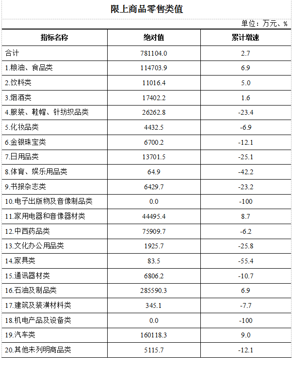 在限额以上批发和零售业20个类值中有6个比上年增长,14个比上年下降。其中汽车类增长9.0%;家用电器和音像器材类增长8.7%;粮油、食品类增长6.9%;石油及制品类增长6.9%;饮料类增长5.0%;烟酒类增长1.6%。服装、鞋帽、针纺织品类下降23.4%;书报杂志类下降23.2%;日用品类下降25.1%;文化办公用品类下降25.8%;体育、娱乐用品类下降42.2%。